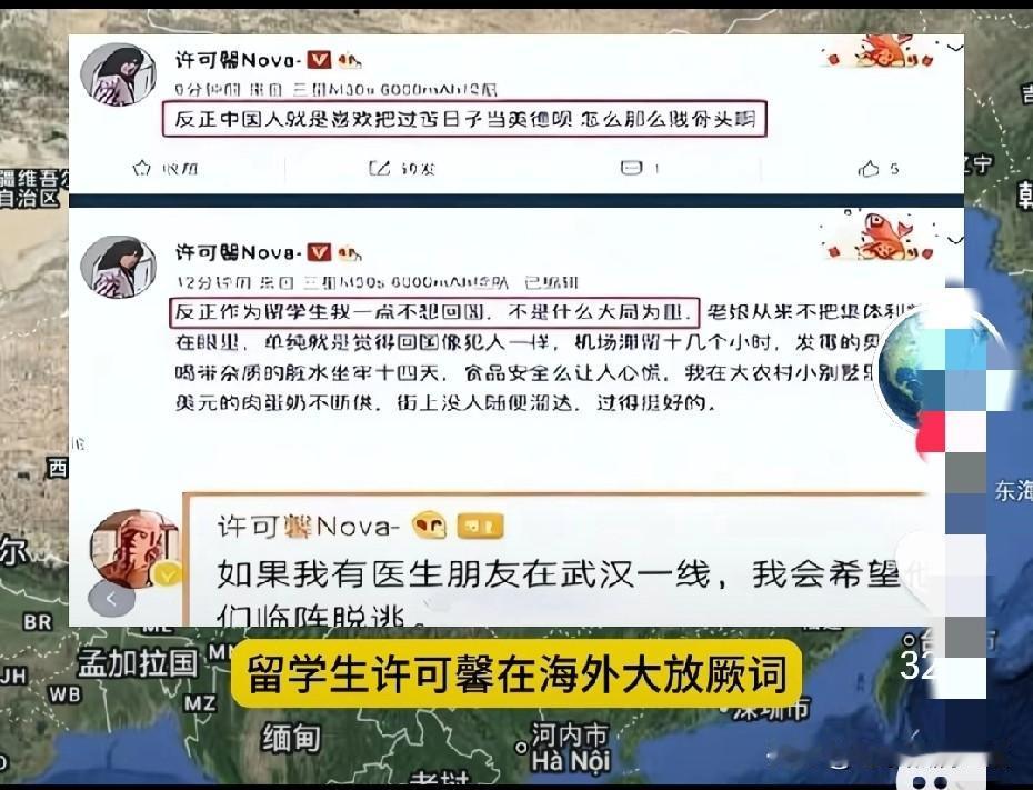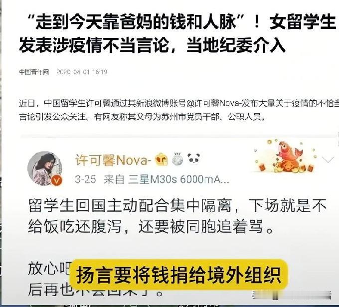 “希望武汉的医生朋友临阵脱逃”的恨国女许某某,移民并嫁给外国人了。 曾公开表示自己的成就全靠家里的钱和人脉被调查。 据说她在国外留学毕业后,给国内很多企业投简历都没人敢用,大家在背调的时候,一查满网都是他在武汉最紧张的时候说的让人大跌眼镜的言论,这个目前还没得到证实,毕竟谁也不愿意因为一个自己不敢用、不愿意用、不希望用的人而惹来一身的麻烦,哪家企业也不会公开说他们为了她恨国而拒绝录用吧。 现在这样的结果,应该是对所有人都是好事,既不用担心她在国外玩够了,回国找个老实人嫁了,那些曾经给他提供帮助的个人和机构也不用担心哪天再给全说出来了,把他们架在火上烤。 最主要的是,能够净化国内的网络环境,眼不见心不烦。 许某某对于这些可从来没在乎过,毕竟她说我们都是贱骨头,她自己过的开心才最重要,你看这短短的几年时间,就在外国男朋友每天高蛋白的滋润下,体态多么丰硕。 有人说她会被打入斩杀线,那倒是多虑了,至少她这一代人不会,她在国内肯定还有资金来源去支撑她的生活的,她既然敢说靠爸妈的钱和权利,家里条件一定差不了。 你觉得她会不会被斩杀?