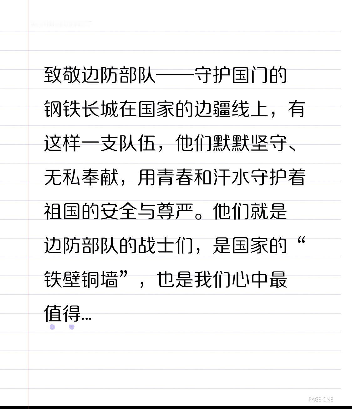 致敬边防部队——守护国门的钢铁长城 在国家的边疆线上,有这样一支队伍,他们默默坚守、无私奉献,用青春和汗水守护着祖国的安全与尊严。他们就是边防部队的战士们,是国家的“铁壁铜墙”,也是我们心中最值得敬爱的英雄。 边防部队肩负着维护国家领土完整、边境安全的重要使命。在复杂多变的国际局势和繁重的边境任务面前,他们始终坚守岗位,不畏艰难险阻,用实际行动诠释着忠诚与担当。无论是严寒酷暑,还是风雨交加,边防战士们都坚守在第一线,确保边境的安宁与稳定。 他们不仅仅是守护边疆的“守门员”,更是民族团结的象征。在边境线上,来自不同民族的战士们携手合作,共同维护国家的尊严。他们用实际行动践行“爱国、敬业、奉献”的精神,彰显着中华民族团结一心的伟大力量。 边防部队的战士们还积极参与边境地区的民生建设,帮助当地人民改善生活条件,开展文化交流,促进民族团结。这些细微而温暖的行动,展现了他们对人民群众的深厚感情和责任担当。 值得一提的是,边防战士们在维护国家安全的同时,也在应对各种突发事件中展现出了极高的专业素养和勇气。无论是打击走私、反恐维稳,还是应对自然灾害、援助救援,他们都冲锋在前,用行动守护着每一寸土地。 作为一名普通人,我由衷敬佩边防部队的战士们。他们用青春和热血书写了新时代的英雄篇章,是我们国家最坚实的守护者。正是有了他们的守护,我们才能安心工作、学习和生活,享受和平的阳光。 让我们向边防部队的所有战士致以崇高的敬意!感谢你们的坚守与奉献,你们是国家的钢铁长城,是我们心中最可爱的人。愿你们平安归来,愿祖国的边疆永远安宁! 祖国的边防兵 祖国的边防