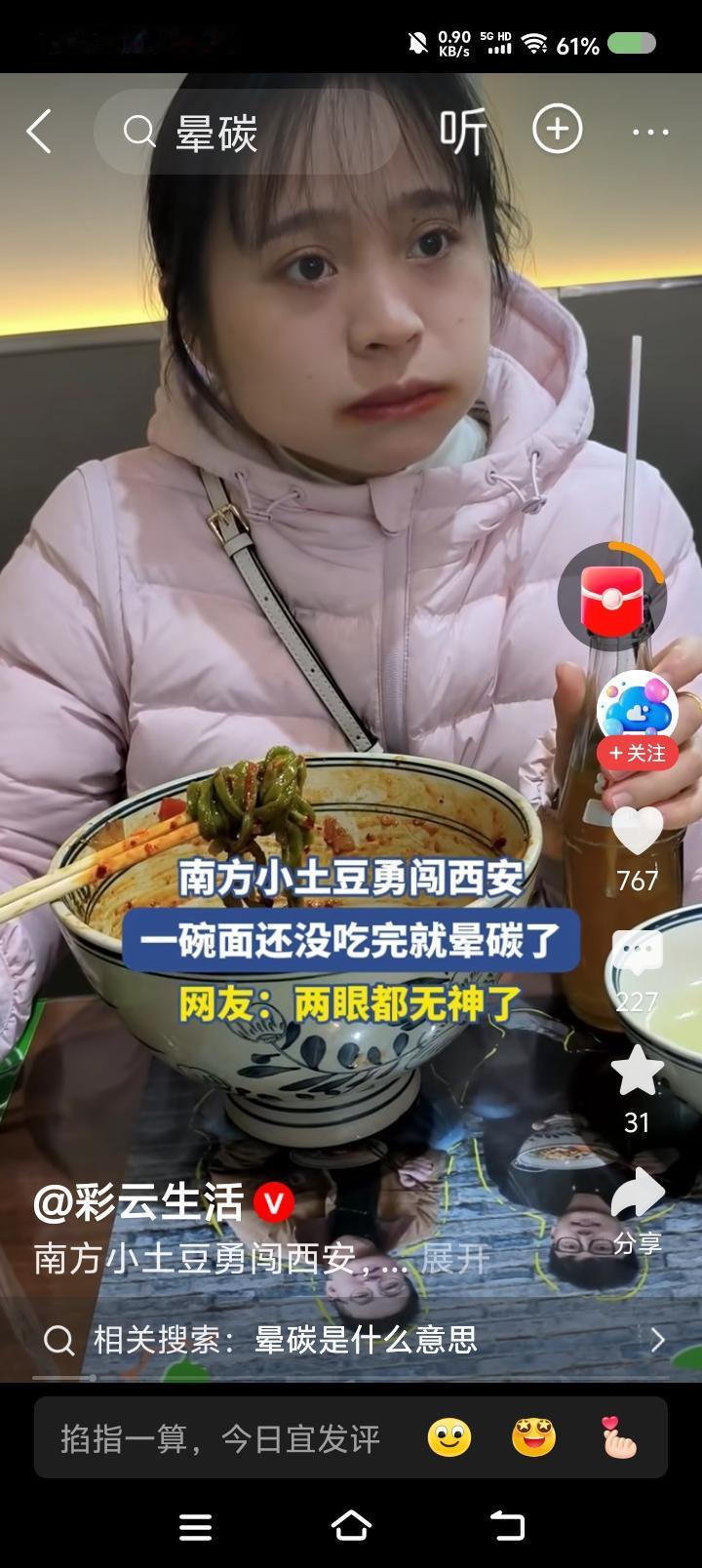 真能晕碳?—— 据报道,南方小土豆勇闯西安,一碗面未吃完,晕碳了。两眼发愣。