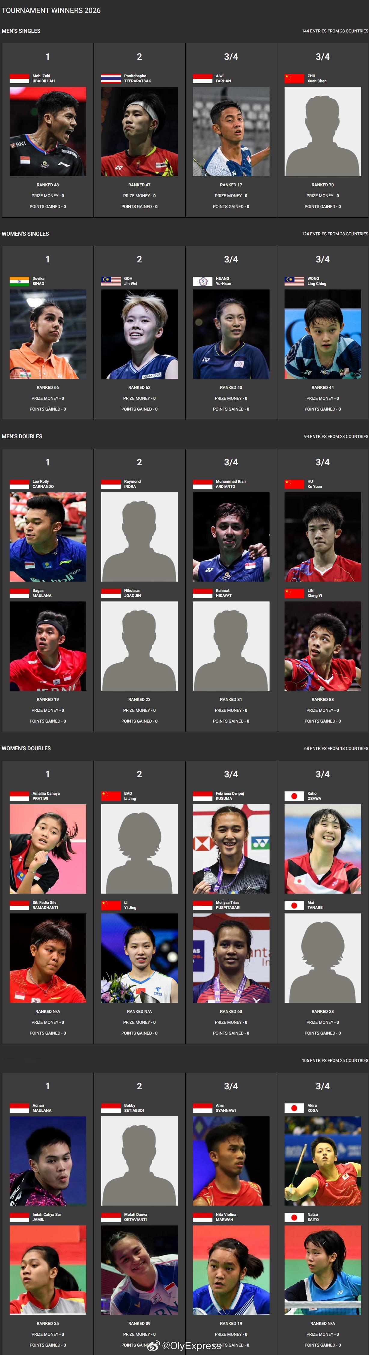 【泰国羽毛球大师赛决赛赛果:印尼4冠2亚】2026年泰国羽毛球大师赛羽联超级赛 2月1日曼谷,世界羽联超级300泰国大师赛落幕,印尼队在决赛中大获全胜赢得4冠2亚,决赛完全赛果如下:女双:鲍骊婧/李怡婧21-15/15-21/18-21普拉蒂维/拉马丹蒂(印尼)男双:卡南多/毛拉纳(印尼)21-10/21-17因德拉/华金(印尼)女单:西哈格(印度)21-8/6-3吴堇溦(退赛,马来西亚)混双:毛拉纳/贾米尔(印尼)18-21/21-19/21-17塞蒂亚布迪/奥克塔维安蒂(印尼)男单:乌拜迪拉(印尼)21-19/20-22/21-19提拉拉特萨库尔(泰国)