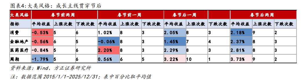 从2015年至2025年的历史表现来看,A股市场在春节窗口期间呈现出稳定的“四段式”节奏:春节前两周通常进入结构性调整阶段,市场风险偏好收敛,资金流向防御性板块,中小盘及高弹性方向调整更为明显;随着节日临近,春节前一周市场情绪边际回暖,进入普遍修复期,主要指数与风格多数转正;春节后一周市场迎来典型的情绪驱动脉冲,风险偏好快速回升,成长、TMT及小盘等高β资产弹性显著突出;而至春节后两周,行情逐步由情绪推动过渡至趋势延续,市场波动降低,呈现稳步上升态势,风格表现也更趋均衡。