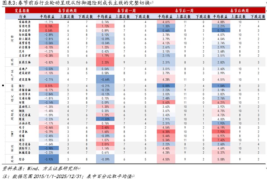 1.基于2015–2025年的历史数据,将行情节奏系统拆解为四个阶段,我们发现:节前两周市场通常进入“调整期”,风险偏好收敛;节前一周转向“修复期”,情绪边际回暖,市场普遍企稳反弹;节后首周呈现典型的“脉冲期”,风险偏好快速释放;节后两周,行情逐步过渡至“趋势期”,市场波动降低,走势趋于稳步上行,结构亦更趋均衡。