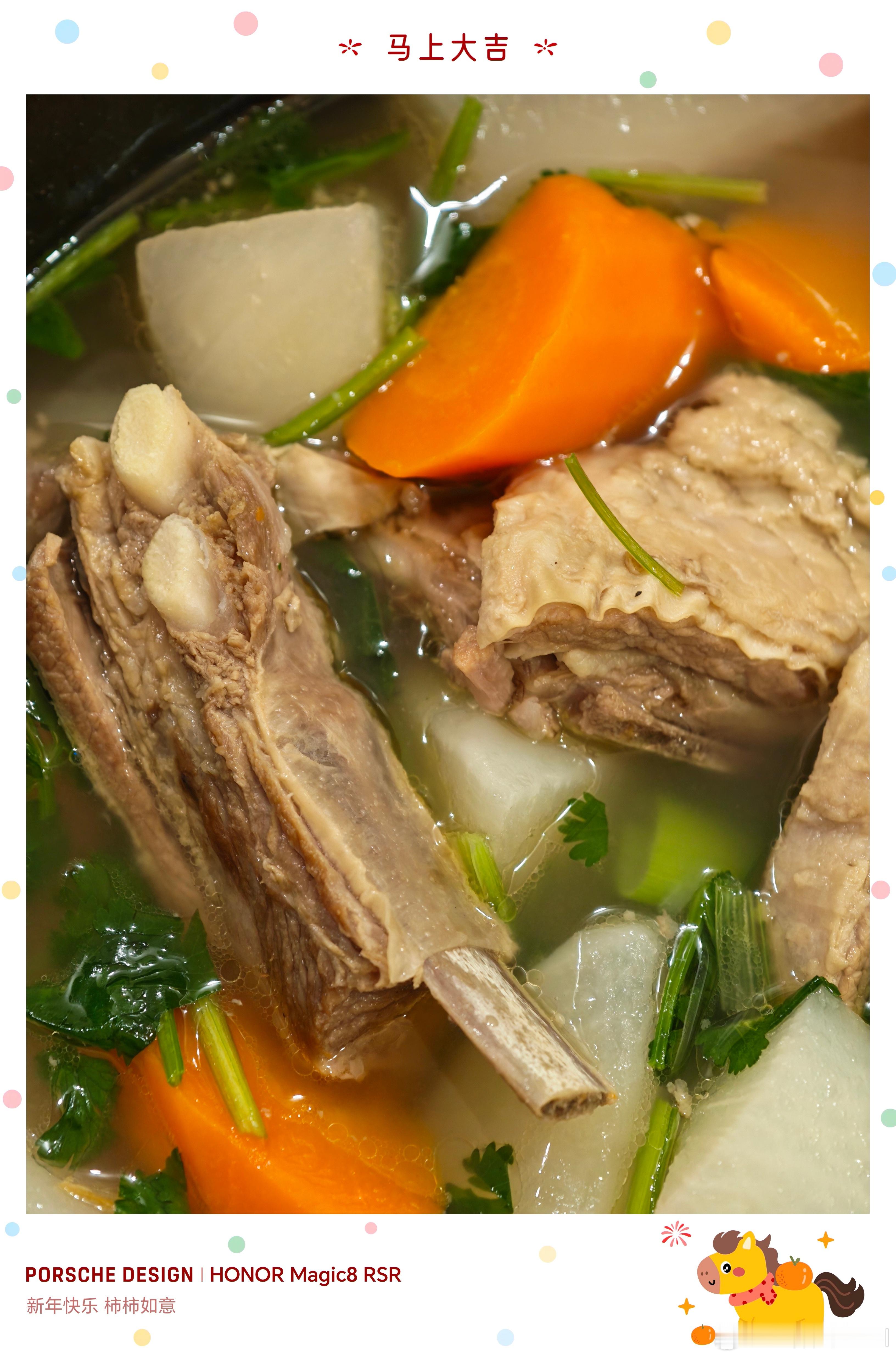 搭配胡萝卜和白萝卜的汤,一点也不油腻,非常鲜甜~