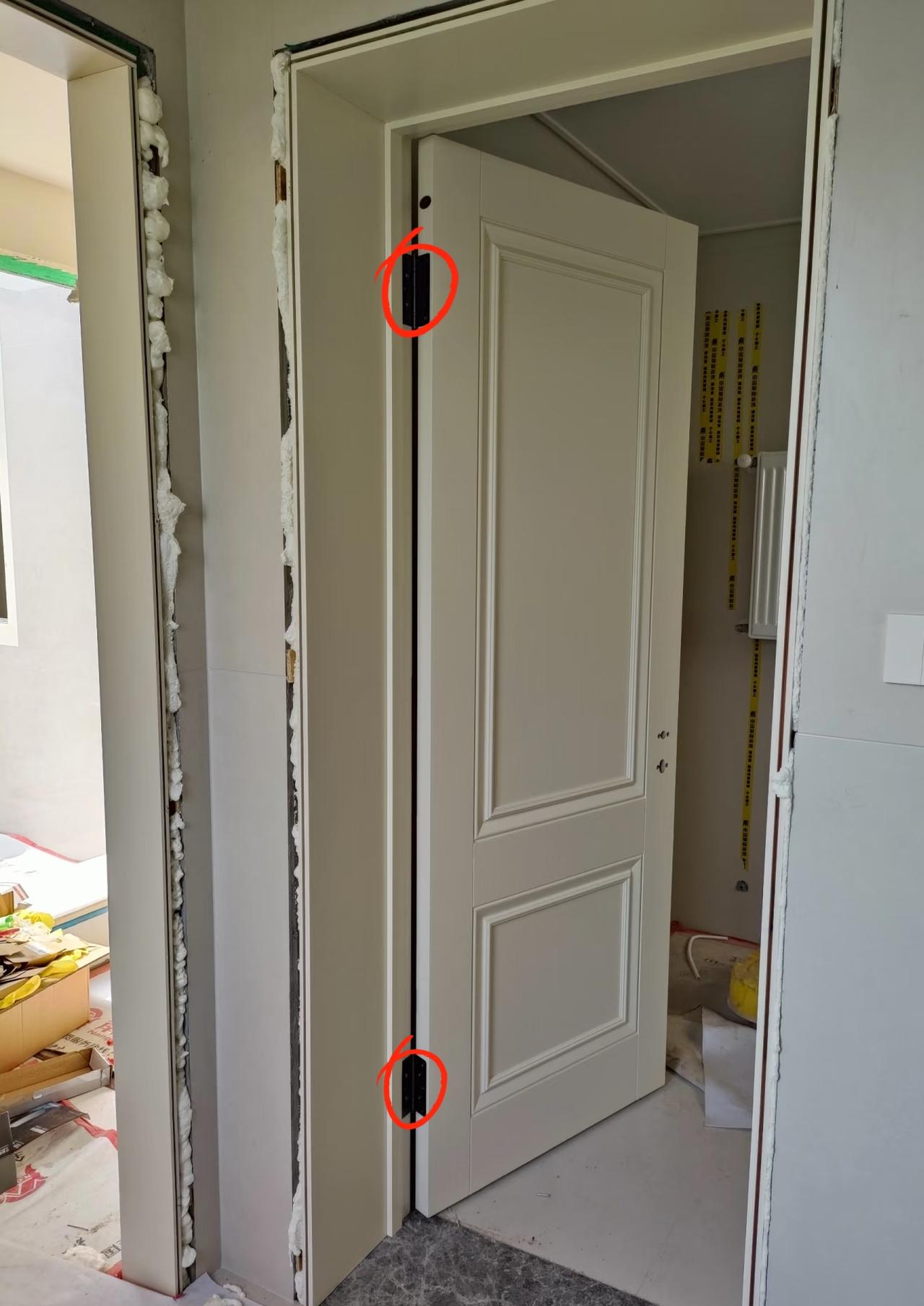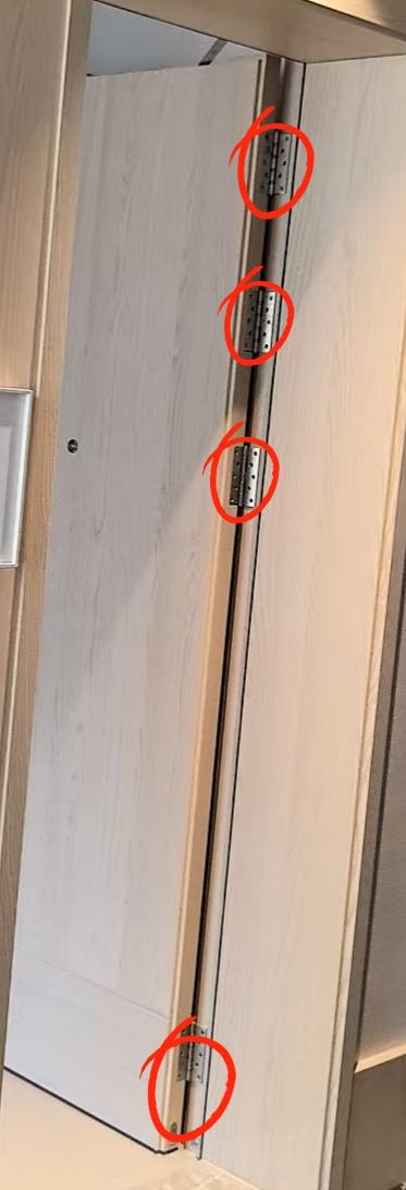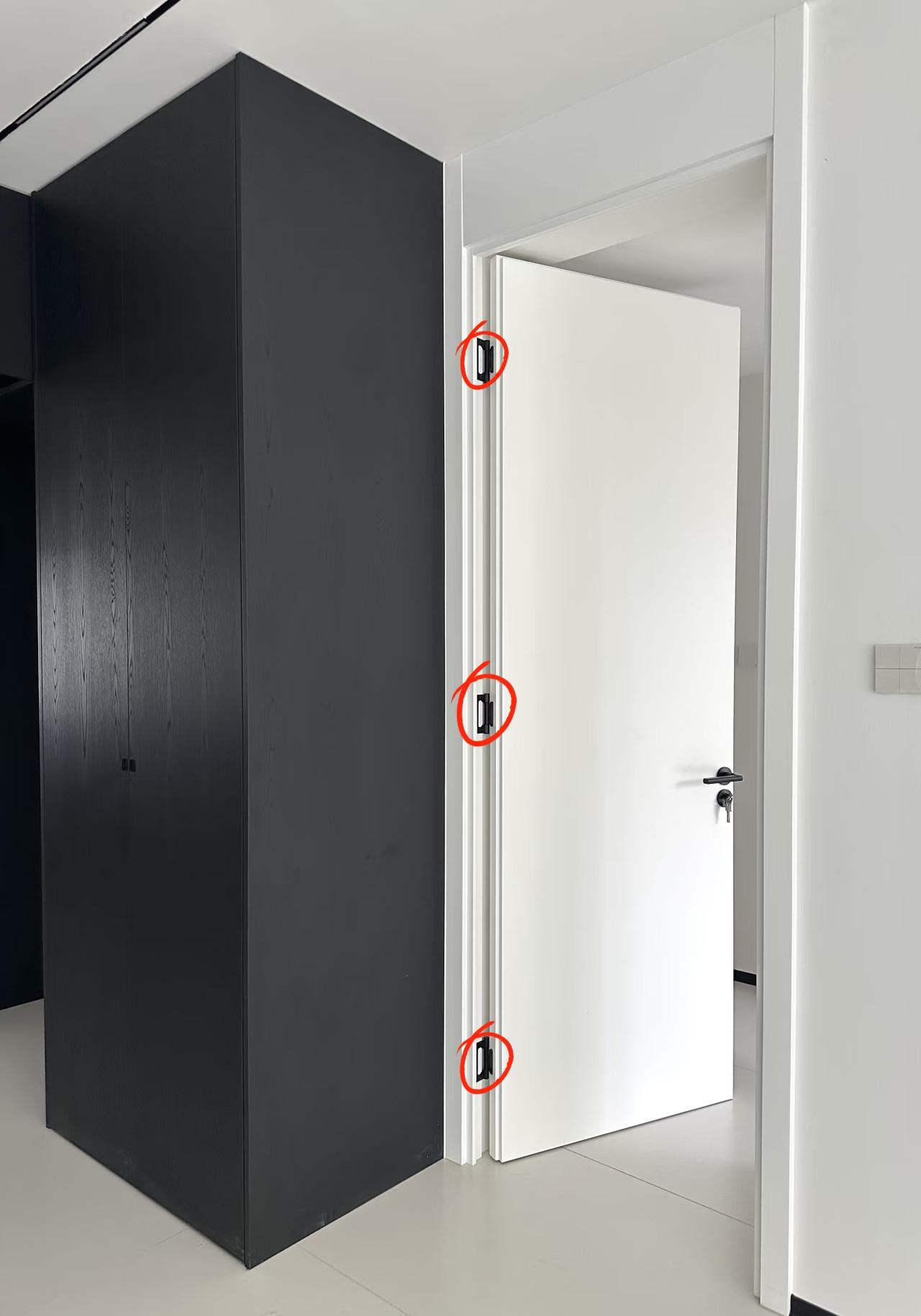 酒店木门采用了四个全平开合页,这个是目前最稳妥安装木门合页安装工艺,三个合页分别安装在隔音门的上半扇位置,一个安装在木门的下半扇底部位置,由于上方是主受力点。所以需要2个以上合页,防止木门重力下坠拖地。 图三,只安装上下两个合页,上方受力点容易脱落。 图四,三个合页均匀安装,而且采用“子母合页”,字母合页没有全平开合页承重强。 如果重型隔音门,全实木门还是建议按图一木门合页安装。