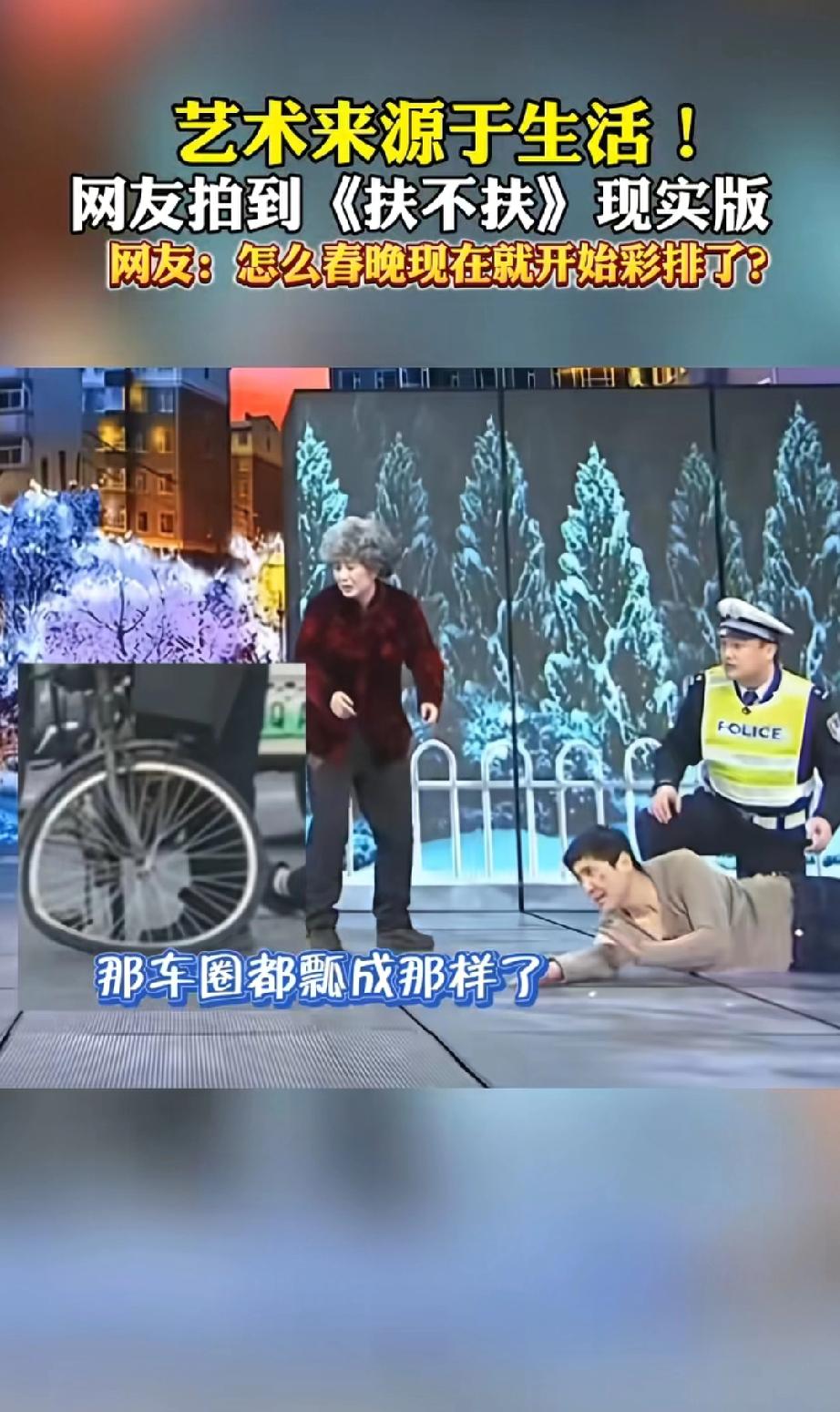 车子对上了, 衣服对上了, 人也对上了, 更可笑的是剧情也对上了! 江苏街头,交警小哥推着一辆自行车,旁边大妈坐在地上,还有个小伙子在旁边站着,这配置和当年沈腾的春晚小品《扶不扶》简直一模一样。 网友笑疯了:“这哪是街头纠纷,明明是春晚提前彩排!” 艺术果然源于生活,就是不知道这位小哥会不会也来一句:大妈,你这车圈都瓢成这样,你是按F键开的挂吧? 扶老人被讹 你支持维权赔偿吗