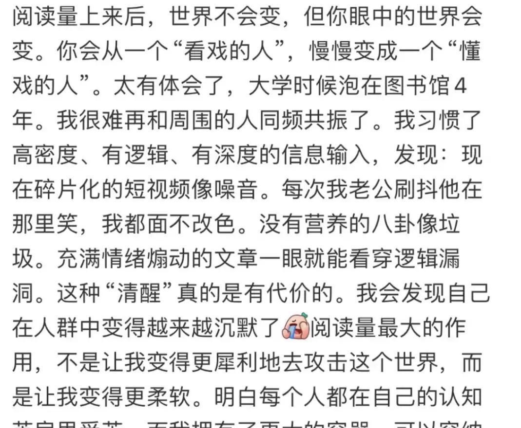 2025年最新国民阅读调查显示,我国成年人人均纸质书只读了4.79本,电子书3.52本,加起来才8本出头,可见很多人一年下来书没翻几页。 很多人觉得读书没用,刷视频来得爽快,结果夜里翻来覆去睡不着,心里堵得慌,遇到事还容易钻牛角尖。 其实读书真正读进去后,它就像慢火炖汤,慢慢给你添底气。那些真正把书读透的人,失眠时翻两页就能让脑子安静下来,纠结是非对错时突然就想通了。它不会让你一夜暴富或瞬间变优秀,却能帮你看清日子怎么过才不那么累,少走弯路,找到属于自己的节奏。 不用硬逼自己一天读多少,更不用非得记笔记。有空就翻开看看,不懂的地方跳过去,戳中内心的就多想一会儿。书里的道理从来不是给高学历的人专属,文化水平再普通,也能从中找到安慰和方向。 关键在于,别把读书当成任务去完成,而是当成给心里加点料。刷多了短视频,大脑容易空转焦虑;真正沉进一本书,反而能松开那些憋着的心结。读进去的书,才是真正帮你解压的良药,让你日子越过越通透。 现在数字化阅读这么方便,手机听书、电子书到处都是,可很多人还是觉得纸质书摸着踏实。数据摆在那,成年人平均阅读量增长慢得可怜,说明很多人还没尝到读书慢慢改变自己的甜头。别再把时间全扔给碎片信息了,拿起书,哪怕一天只看几页,也比一直焦虑强得多。