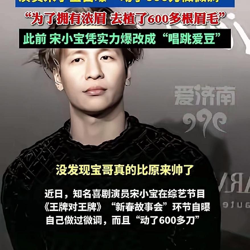 演员宋小宝自曝“动了600刀做微调”!网友:无人相信,这波自带喜剧效果的坦白,直接把内娱的“颜值焦虑”玩成了梗。 在《王牌对王牌》的新春环节里,他一本正经抛出“动了600多刀”的猛料。 现场嘉宾和网友集体开启“打假模式”,毕竟谁也没法把“600刀”和他那张熟悉的脸联系起来。 直到真相揭晓,大家才笑到打鸣——所谓的“600刀”,不过是植眉手术里移植600多根毛囊的通俗说法,每根毛囊的植入都被他戏称为“一刀”。 这恰恰戳破了内娱的虚伪,靠实力吃饭的艺人,根本不用被医美话题绑架。 比起那些遮遮掩掩的完美人设,宋小宝这种大大方方玩梗的松弛感,反而更让人觉得真实可爱。 从爆改成“唱跳爱豆”到植眉600根,他用一次次反差证明,观众爱的从来不是无瑕疵的脸,而是有趣的灵魂和坦诚的态度。 你觉得艺人该不该大方聊医美话题,更吃真实感还是完美人设?宋小宝 宋小宝演技 宋小宝魔性舞 宋小宝小品小偷 吉林宋小宝 上海宋小宝 宋小宝古装照