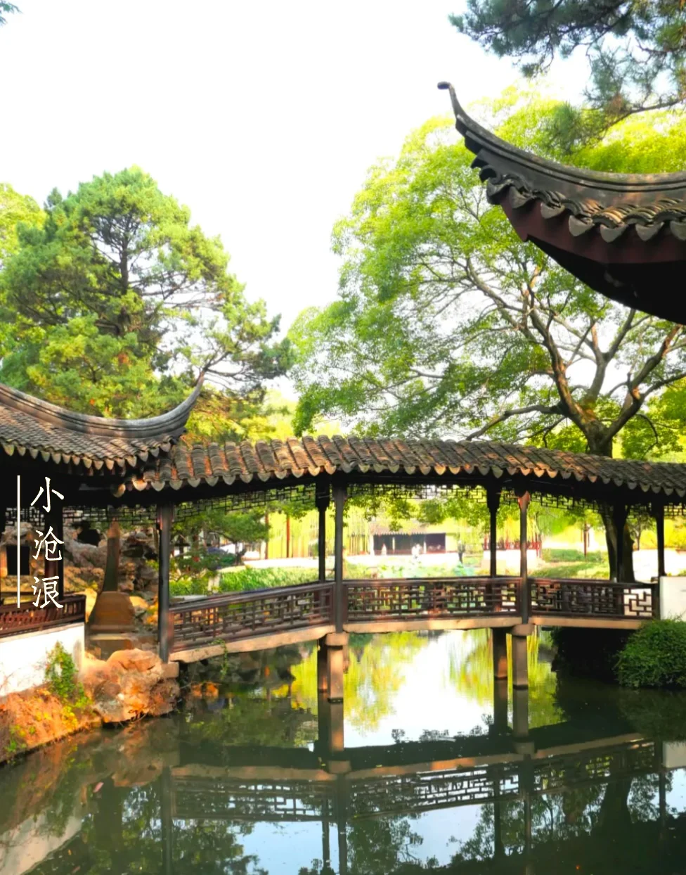 小沧浪水阁架临水面之上,正北直对小飞虹廊桥,由此北望,景色深远,层次较多