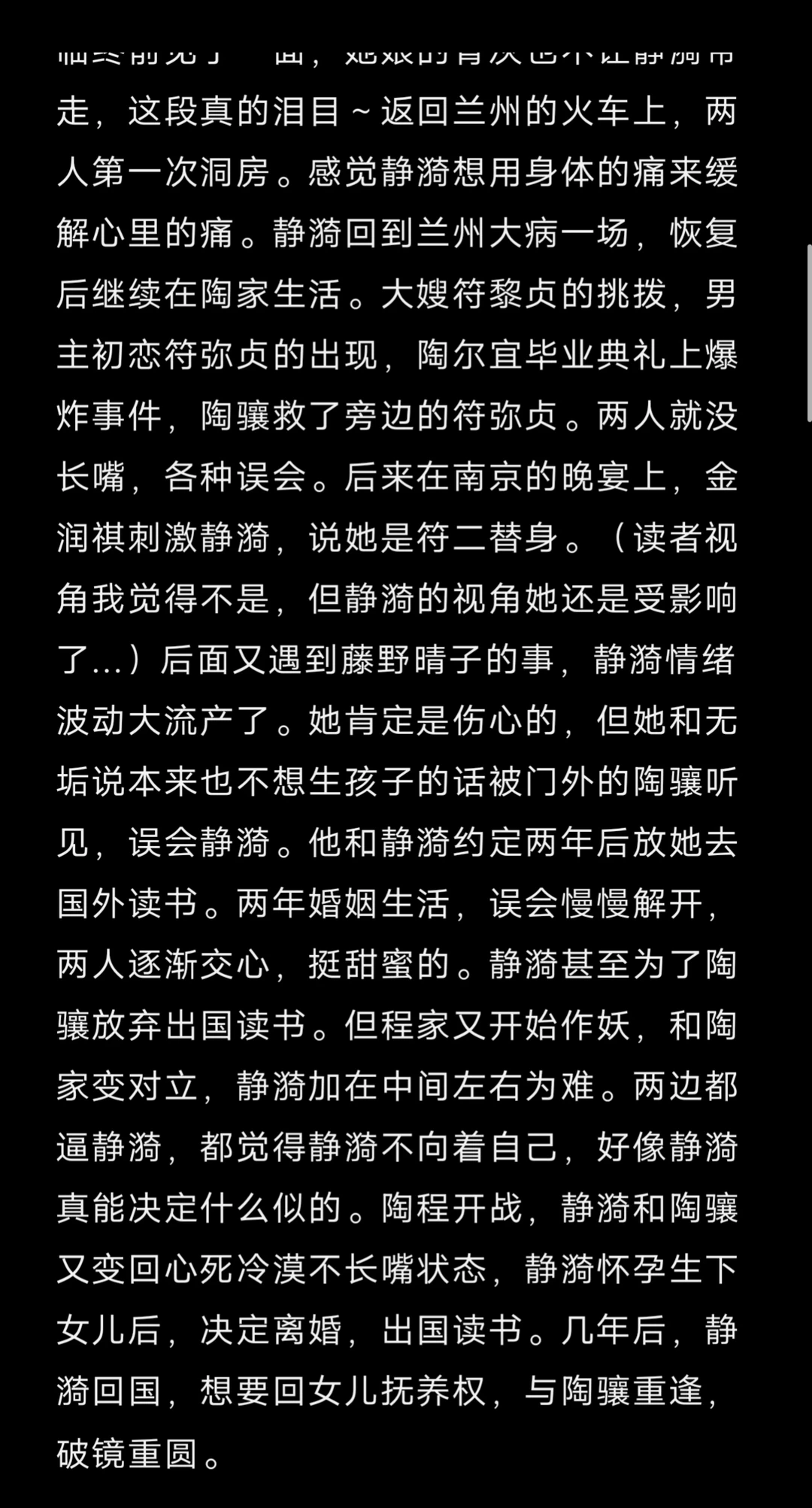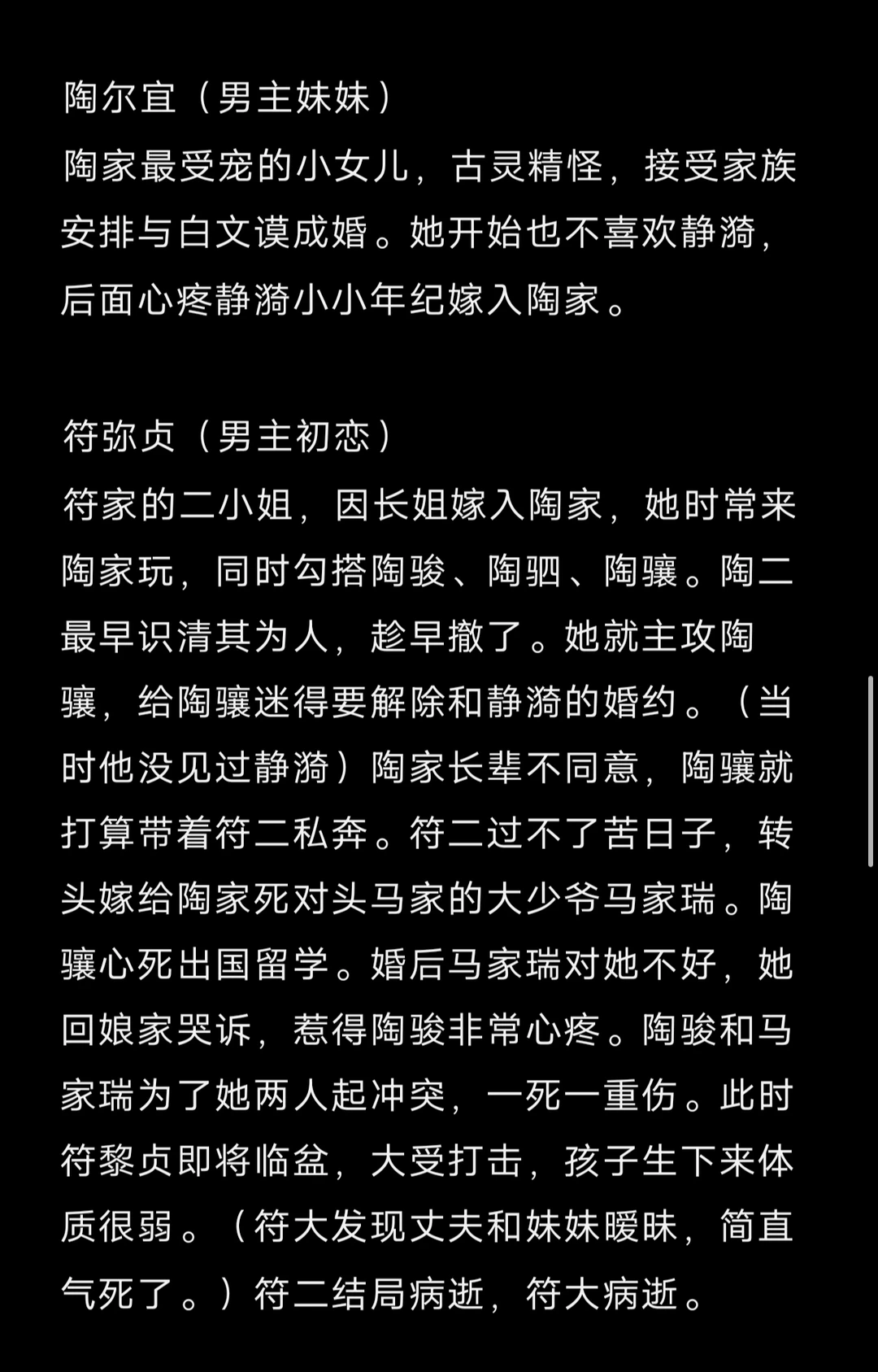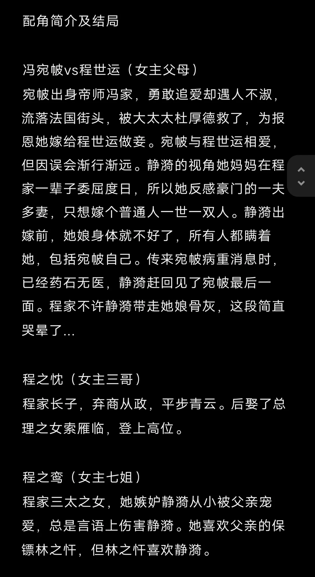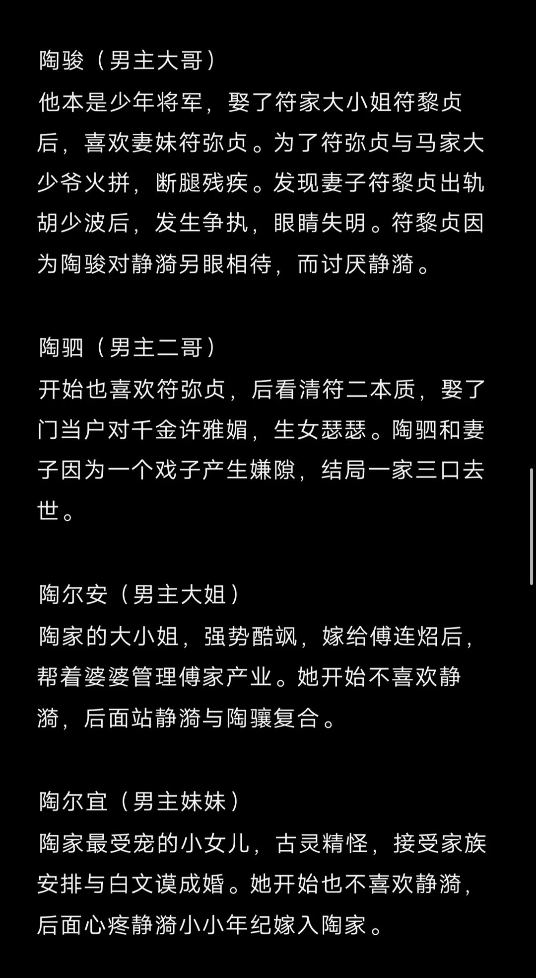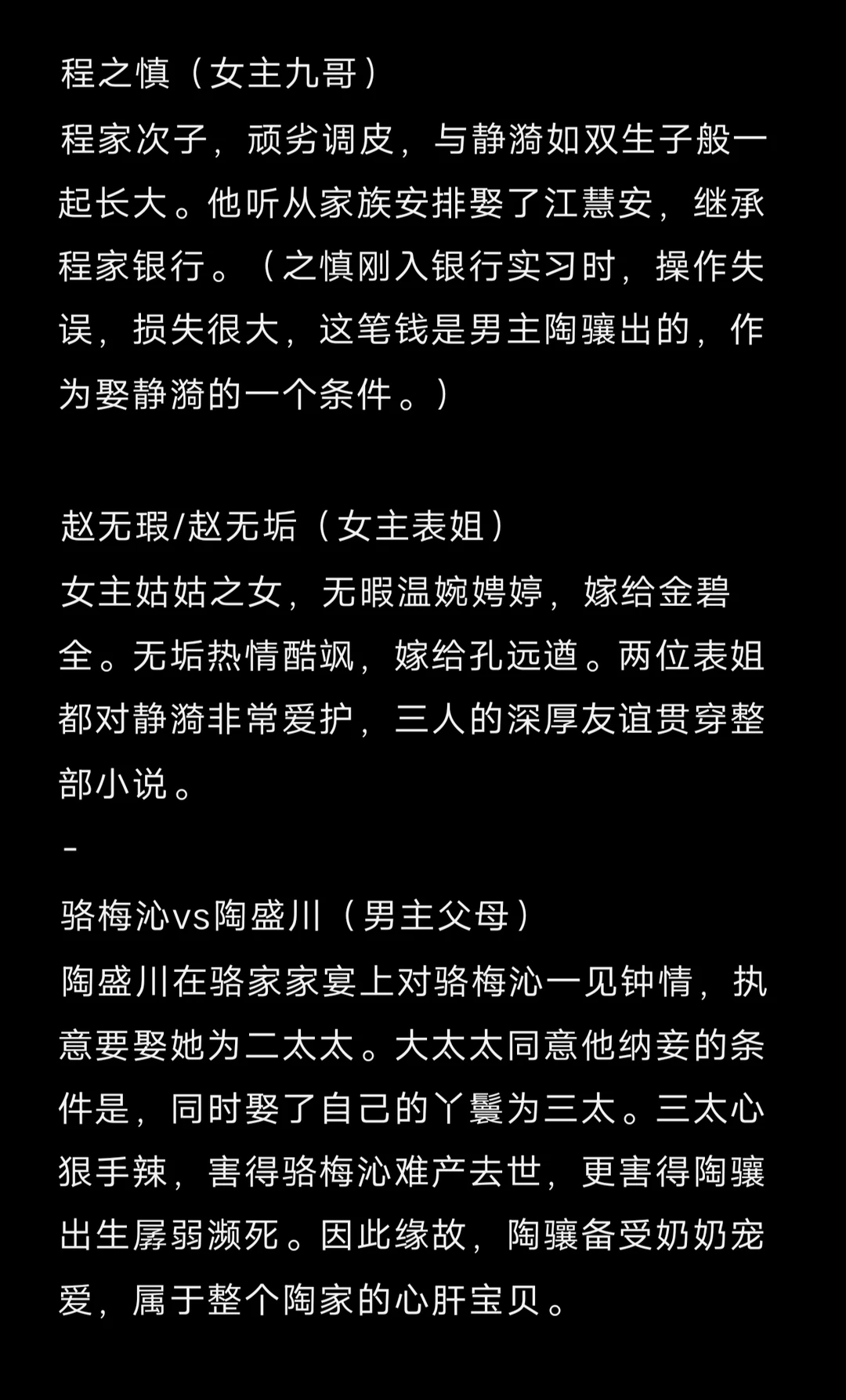 先婚后爱/酸涩/久别重逢/带球跑/破镜重圆梗/ 程家 程世运(女主父亲) 杜厚德 大太太(女主嫡母) 冯宛帔 二太太(女主母亲) 那映红 三太太 李翠翘 四太太 1程之畋 2程之攸 3程之忱(妻子索雁临) 4程之敬 5程之效 7程之鸾 8程之凤(丈夫孟鼎臣) 9程之慎(妻子江慧安) 10程静漪(女主) 赵家 程芳芸(女主姑姑) 赵广耐(姑父) 1赵无忧(丈夫汪南荪) 2赵宗卿 3赵无暇(丈夫金碧全) 4赵无垢(丈夫孔远遒) 孔家 孔智孝(男女主证婚人) 1孔远遒(妻子赵无垢) 2孔远遥(喜欢程之慎) 3孔远达 陶家 陶老夫人(男主奶奶) 陶盛川(男主父亲) 胡祖芬(男主嫡母) 骆梅沁 二太太(男主母亲) 沅 喜 三太太 陶因泽(大姑奶奶) 陶因润(三姑奶奶) 陶因清(四姑奶奶) 1陶骏/辔之(妻子符黎贞,儿子麒麟) 2陶驷/御之(妻子许雅媚,女儿瑟瑟) 3陶尔安(丈夫傅连炤) 7陶骧/牧之(男主) 8陶尔宜(丈夫白文谟) 喜欢陶骧的女人 黄珍妮、金润祺、苏美珍、符弥贞 喜欢静漪的男人 逄敦煌、林之忓、梅季康、戴孟元