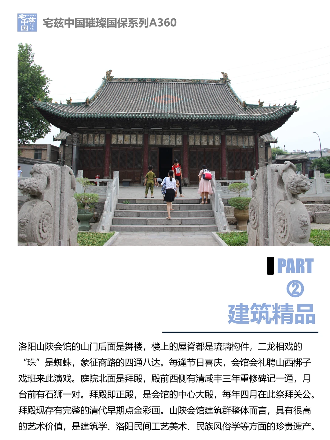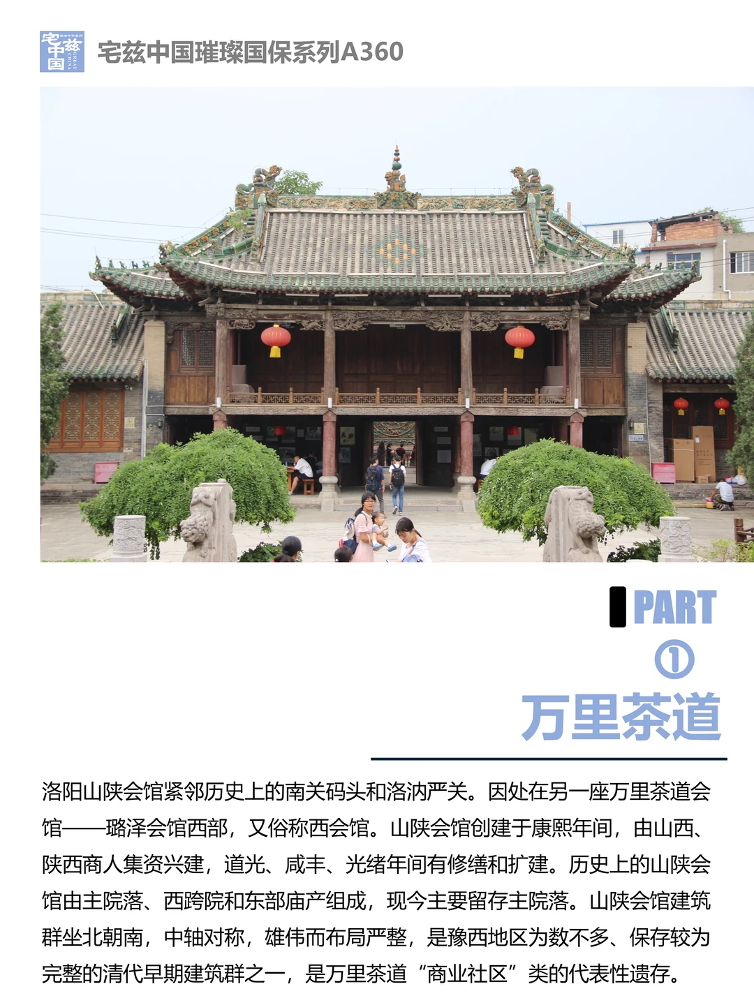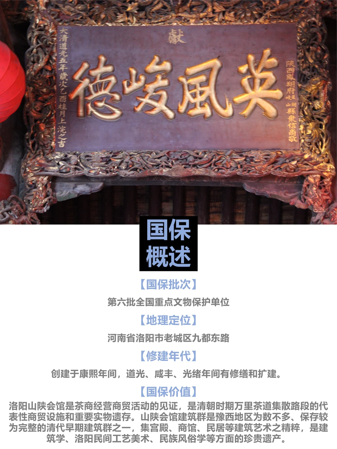 山陕会馆创建于康熙年间,由山西、陕西商人集资兴建,道光、咸丰、光绪年间有修缮和扩建,是茶商经营商贸活动的见证,是清朝时期万里茶道集散路段的代表性商贸设施和重要实物遗存。山陕会馆建筑群是豫西地区为数不多、保存较为完整的清代早期建筑群之一,集宫殿、商馆、民居等建筑艺术之精粹,是建筑学、洛阳民间工艺美术、民族风俗学等方面的珍贵遗产。山陕会馆基本无木不雕、无石不刻,最南端琉璃照壁是豫西保存最完好的琉璃照壁。