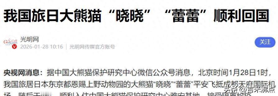 晓晓蕾蕾回国了,日本全国没熊猫了,这事儿真跟“抗日”有关吗? 上野动物园门口排了千米长队,零下5度天,大人小孩裹着围巾站四五个小时,就为看它们一分钟。1月27号那天,两只熊猫坐专机走了,没回头。东京都政府提前一个月通知中方送还,原定2026年2月,最后定在1月下旬。这不是临时起意,而是谈不拢——续租没成,协议到期,就按规矩办。 熊猫从来不是白送的。1972年那会儿,“康康”和“兰兰”去日本,是中日建交的见证,不是礼物。后来改成租借,得签协议、建场馆、定期检查,还得尊重中国核心利益。高市早苗11月说“台湾有事就是日本存亡危机”,这话在国会讲的,不是私下聊天。中方第二天就抗议,之后停了海鲜进口、航班,熊猫这事也卡住了。 日方说这是“个人看法”,可中方看的是行动。你一边踩红线,一边还想租熊猫?连场馆升级的钱都拖着不付,养护标准也没达标。马来西亚续了十年,法国马克龙开口就答应,为啥日本不行?不是中国小气,是合作前提塌了。 上野周边商家说客流掉了三成,明信片、玩偶卖不动了,连幼儿园老师带孩子来看最后一眼。有人从北海道赶来,蹲了三天。可熊猫不是用来哄人的吉祥物,它们是活的,要吃竹子、要配兽医、要全球配对繁育。4岁半的晓晓和蕾蕾该回中国参与繁殖计划了,这是科学安排,不是政治报复。 台湾那边也有人想拿熊猫做文章,说什么“日台动物交换”。可台北动物园的大熊猫,是大陆赠的,所有权在中国。民调显示七成以上台湾民众反对这种操作,觉得是“出卖国宝”。这事根本站不住脚。 晓晓和蕾蕾走了,日本50年来的熊猫岁月就断了。不是谁不让来,是没人愿意往一个不守约、不尊重底线的地方送国宝。竹子运过去容易,信任重建太难。 熊猫归国那天,机场没有横幅,没有仪式,只有专机起飞的声音。