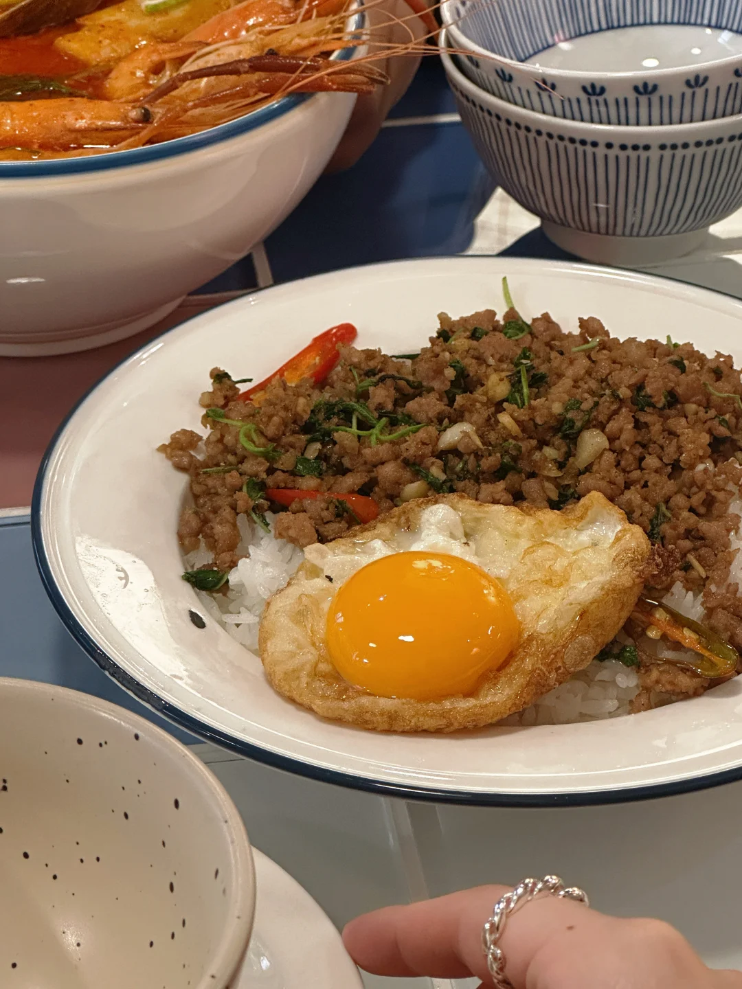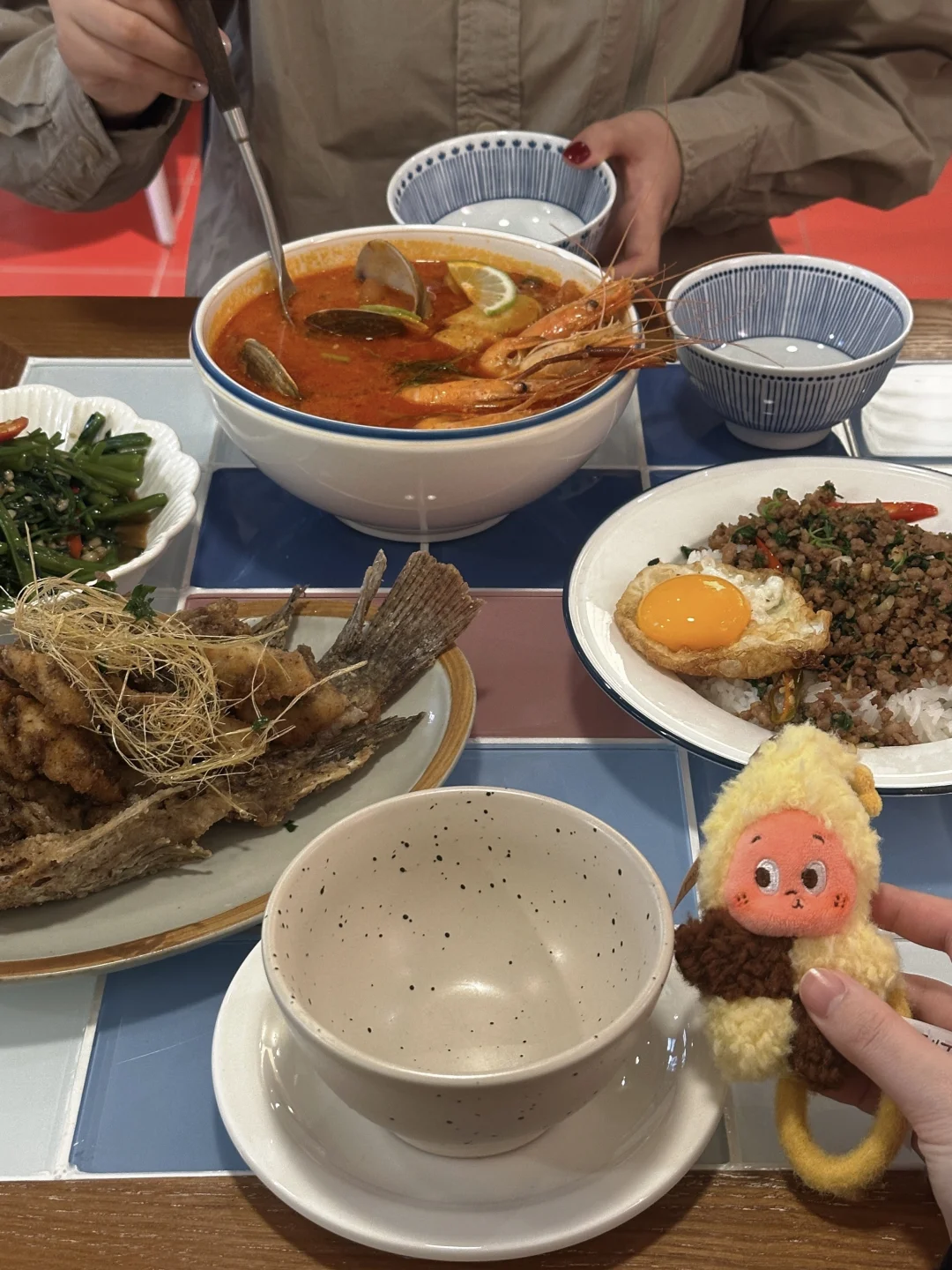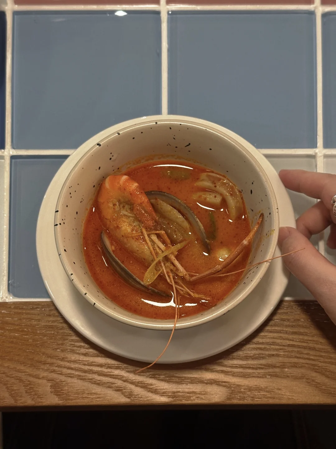 冬阴功汤好喝诶 应该放了很多番茄一起煮 喝得到起沙的番茄感 要是再辣一点就完美了