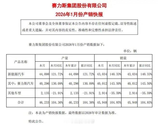 赛力斯集团发布2026年1月产销快报,新能源汽车板块表现亮眼。数据显示,1月赛力斯新能源汽车产量达44098辆,同比增长121.72%;销量43034辆,同比增幅140.33%。