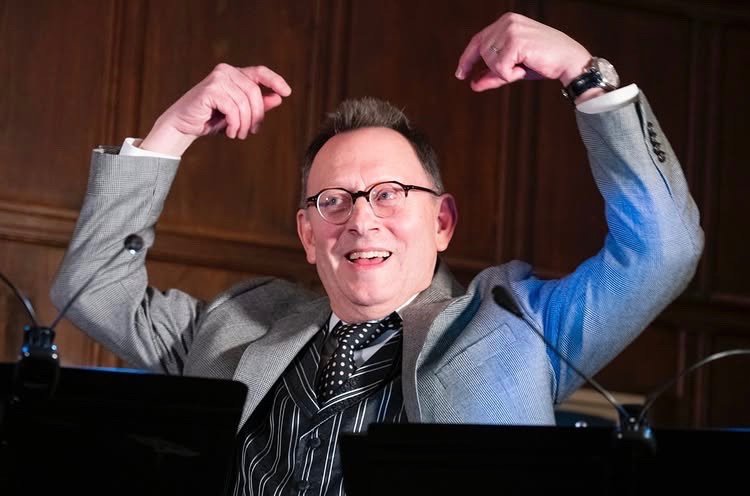 “宅总”新图~ 迈克尔·爱默生出席剧团慈善活动,现场朗读了滑稽剧《荒唐女士们》并
