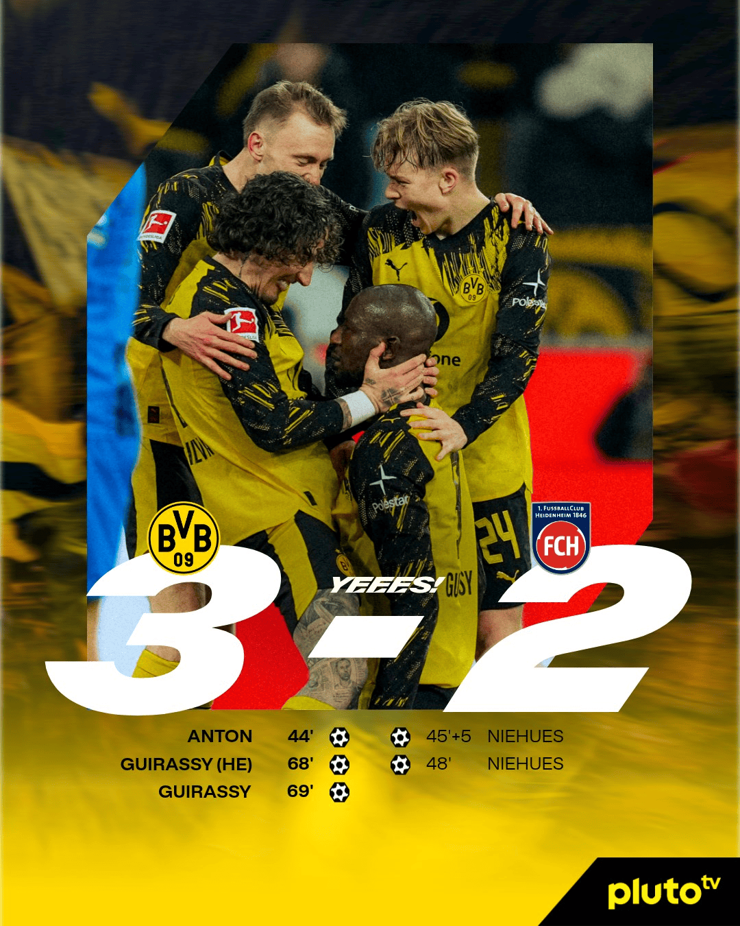 安东在上半场尾声首开记录,但尼许斯在上半场最后时刻和下半场刚开始连入两球帮助海登海姆在客场一度反超比分。此后当天购买的连续换上丘库埃梅卡、拜尔大举进攻,最终由吉拉西梅开二度反超比分。