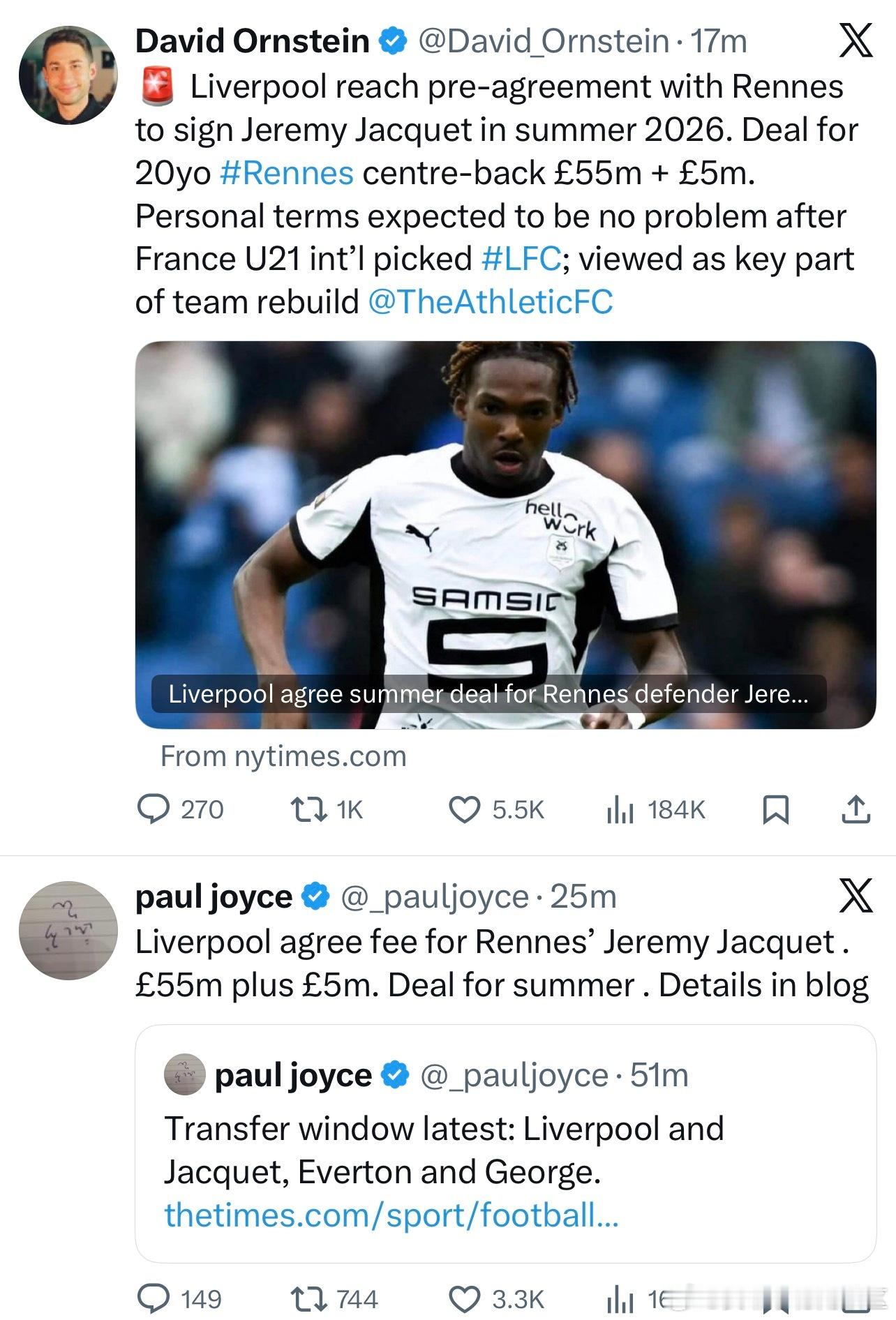 一觉醒来,雅奎特黑喂狗了!!各大记者通稿,转会费5500万英镑➕500万英镑的附加条款,我军提前和雷恩达成协议球员夏窗加盟。球员选择我军之后个人条款也不是问题了! 同时我军也已经安排好了让雅奎特周一接受体检
