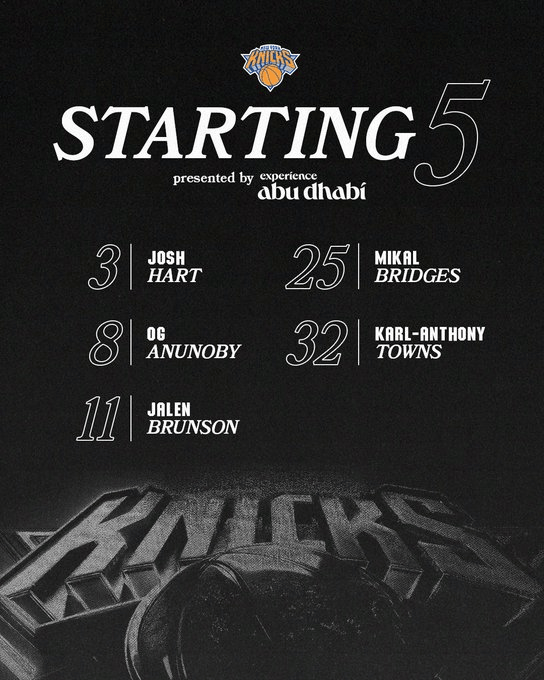 尼克斯首发:布伦森、阿奴诺比、布里奇斯、哈特、唐斯。