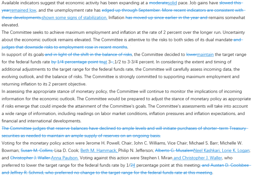 图表1:美联储货币政策声明对比(2026年1月vs2025年12月)
