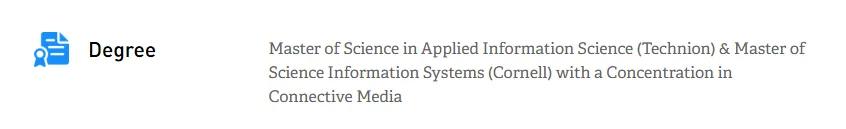 一,双学位。毕业拿到两所学校各自独立颁发的学位,一张是康奈尔大学的信息系统硕士(M.S. in Information Systems),另一张是以色列理工学院的应用信息科学硕士(M.S. in Applied Information Science)。