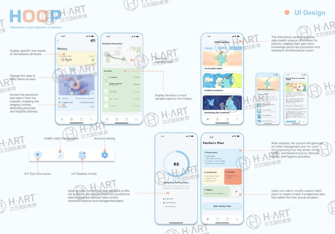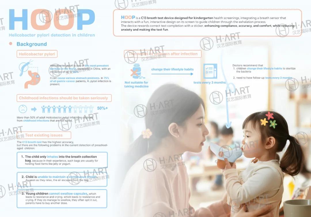 比如项目之一《HOOP》,拿了伦敦设计奖、圆点设计奖,关注的是“幽门螺杆菌”的检测。这本来是一个常规的疾病向产品设计,但是M同学将落脚点放在了疾病背后的中国社会现象上。