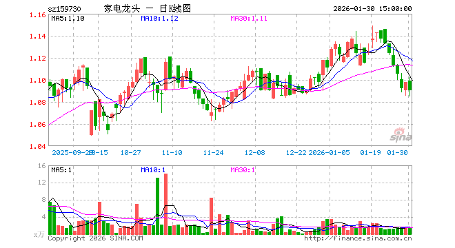 1月30日,龙头家电ETF(159730)跌0.73%,成交额146.88万元。当日份额增加100.00万份,最新份额为4657.13万份,近20个交易日份额增加1500.00万份。最新资产净值计算值为5071.15万元。