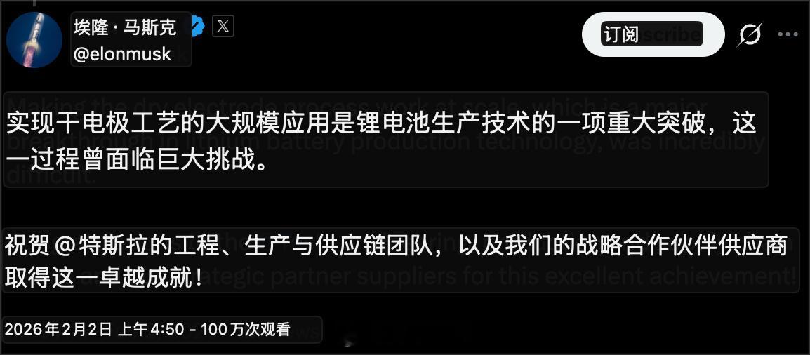 埃隆·马斯克确认特斯拉已解决大规模生产锂电池的干电极工艺。