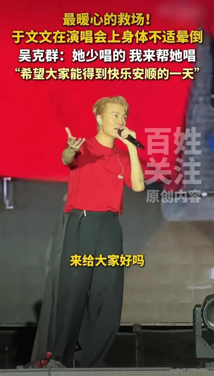 于文文唱歌时晕倒了,而紧急救场的吴克羣这样对现场观众解释救场原因:于文文非常辛苦,身体不适,没有办法把所有喝唱完,但对我来说,所有的歌手都应该彼此帮忙,请你们担待一下,多听我唱两首歌,各位买了票来看演唱会,应该是要得到最快乐的一天,最青春的一天,最安顺的一天! 吴克羣真的是娱乐圈一股清流,现在他的生活重心并不在事业上,而是逐渐把精力放在一些需要被帮助又常常被忽视的弱势群体上,比如和为癌症幼儿每天直播跳舞几小时的父母一起直播跳舞,比如为留守老人在废弃小学办一次晚会等等,从他的救场发言也看得出,他真是一个非常温暖的人。 有些明星,出了车祸找人顶包;有些明星,忙着与前夫的前女友互撕;有些明星,忙于事业累到生病住院;有些明星,常常身体力行的做公益;每个人都在做自己想做的是,我只想说,你给社会什么,社会就会回馈你什么,你给社会温暖,社会就会回馈你善意!