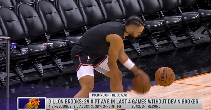 赛中,转播方给出了狄龙-布鲁克斯在德文-布克缺席的近4场比赛中的数据: