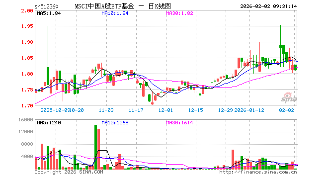 2月2日,MSCI中国A股ETF基金(512360)开盘涨0.16%,报1.828元。MSCI中国A股ETF基金(512360)重仓股方面,贵州茅台开盘涨1.71%,宁德时代涨2.00%,招商银行涨0.54%,工业富联跌1.56%,中国平安跌0.60%,紫金矿业跌8.15%,长江电力涨0.49%,中际旭创跌2.16%,农业银行涨0.15%,寒武纪跌0.79%。