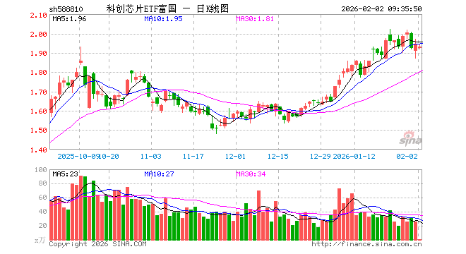 2月2日,科创芯片ETF富国(588810)开盘跌1.08%,报1.924元。科创芯片ETF富国(588810)重仓股方面,中芯国际开盘跌1.28%,海光信息跌1.68%,寒武纪跌0.79%,澜起科技跌0.47%,中微公司跌0.99%,拓荆科技跌4.46%,芯原股份跌3.16%,华虹公司跌1.35%,沪硅产业跌1.38%,东芯股份跌1.96%。