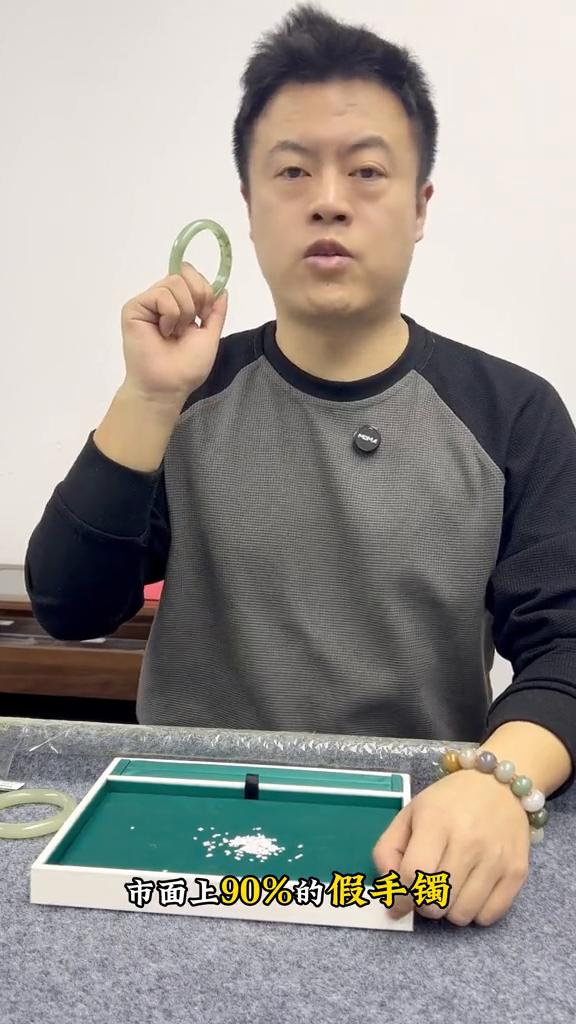这样的毒手镯千万不要戴了。 能够吸附纸屑的手镯千万不要戴了,教你一招鉴别手镯的真假。 ·先准备一点纸屑,拿起手镯在衣服上摩擦十秒钟,镯子微微发热,拿镯子去吸附一下纸屑。如果纸屑可以吸附起来,那么这就是一只注胶的假镯子。 ·这是一只天然的和田玉手镯,用同样的方法在衣服上摩擦十秒钟,再来试一下,它是吸附不起来纸屑的。市面上90%的假手镯都是注胶的,摩擦会使手镯产生静电吸附纸屑。 ·同样的方法还可以测试翡翠手镯、水晶手镯。 如果大家还有什么不明白的可以来我直播间,我会为大家一对一鉴赏玉石。先收藏再测试。