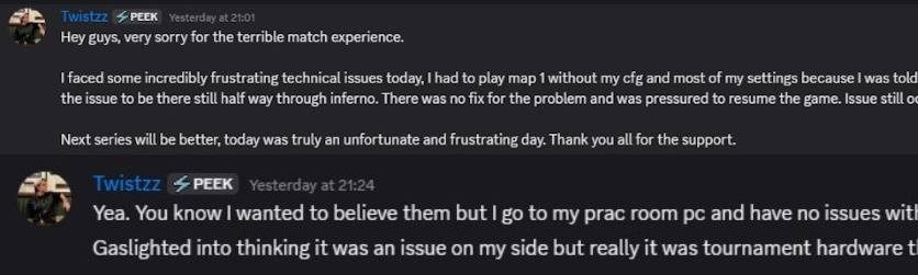 今天我遇到了极其令人崩溃的技术问题。第一张图我全程没法用自己的cfg和大部分设置,他们说问题出在我的cfg上。结果到了Inferno这张图的下半场,故障还是存在。问题根本没有解决,我还被催促着继续比赛,而且这个问题在Nuke整张图里也一直存在。下一场系列赛会好起来的,今天真的是不幸又让人窝火的一天。谢谢大家的支持。