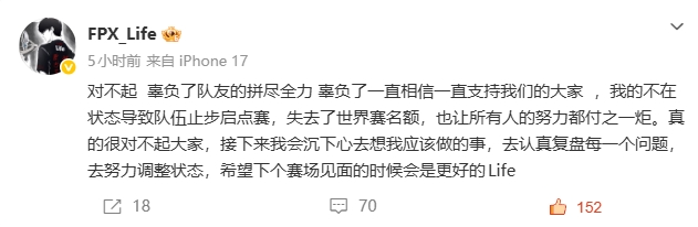 虎扑02月02日讯随着FPX在2026启点赛败者组中以1-2输给JDG后,Life赛后发文:对不起辜负了队友的拼尽全力辜负了一直相信一直支持我们的大家,我的不在状态导致队伍止步启点赛,失去了世界赛名额,也让所有人的努力都付之一炬。真的很对不起大家,接下来我会沉下心去想我应该做的事,去认真复盘每一个问题,去努力调整状态,希望下个赛场见面的时候会是更好的Life