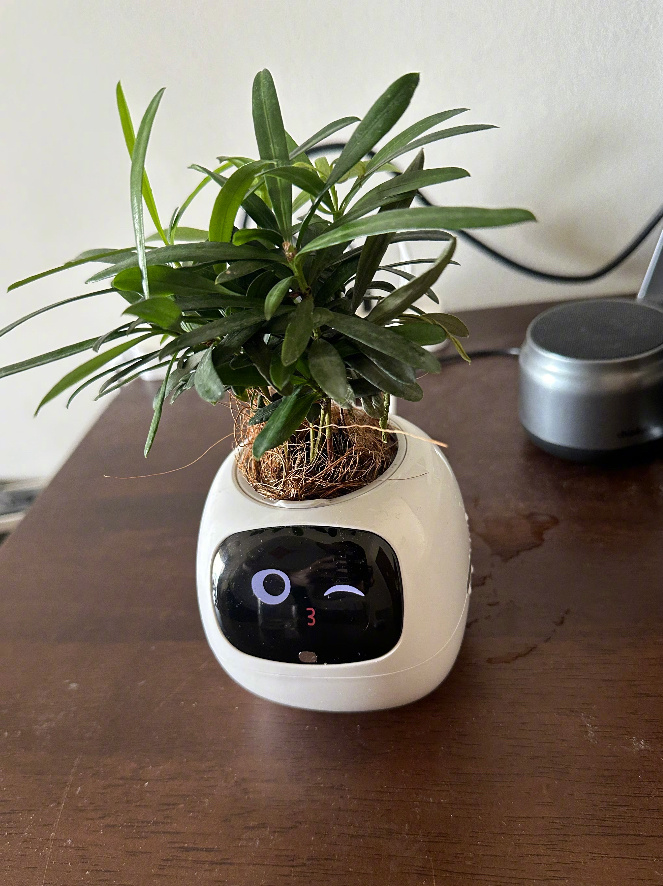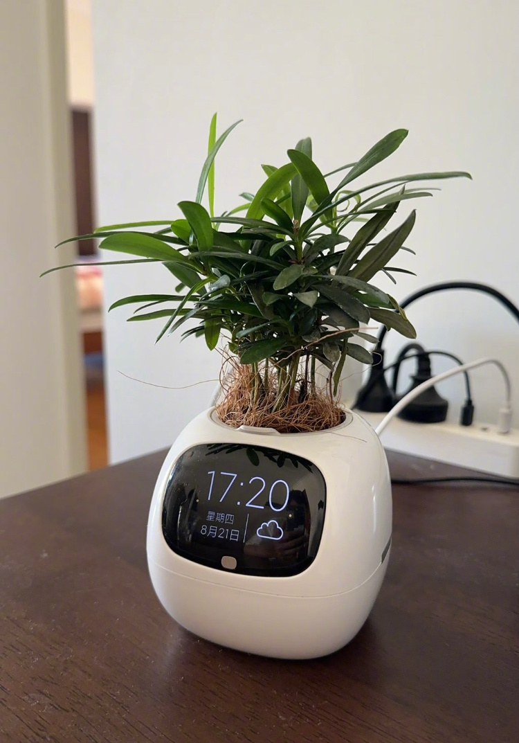 我的低智能花盆,又菜又没谱电子绿植智能花盆桌搭好物 刷公众号手抖入的低智能花盆,属实有点“中看不中用”😂说好的智能交互,操作复杂到像在解密码,语音对话功能更是直接缺席,每次调试都得对着说明书研究半天。虽然它会“卖萌”,时不时弹出各种小表情,开心的咧嘴笑,没水的皱着眉,委屈巴巴的样子。但是纯随机啊,表情逻辑跟传感器毫无关联啊上次出差忘浇水,回来看到它蔫蔫的表情,竟莫名有点愧疚,赶紧补水“哄”它。虽然是个小笨蛋,这些小表情也是真的没用,但皮克斯风格的蠢萌颜值还是可以接受的,算是给生活添了随机的小乐趣~