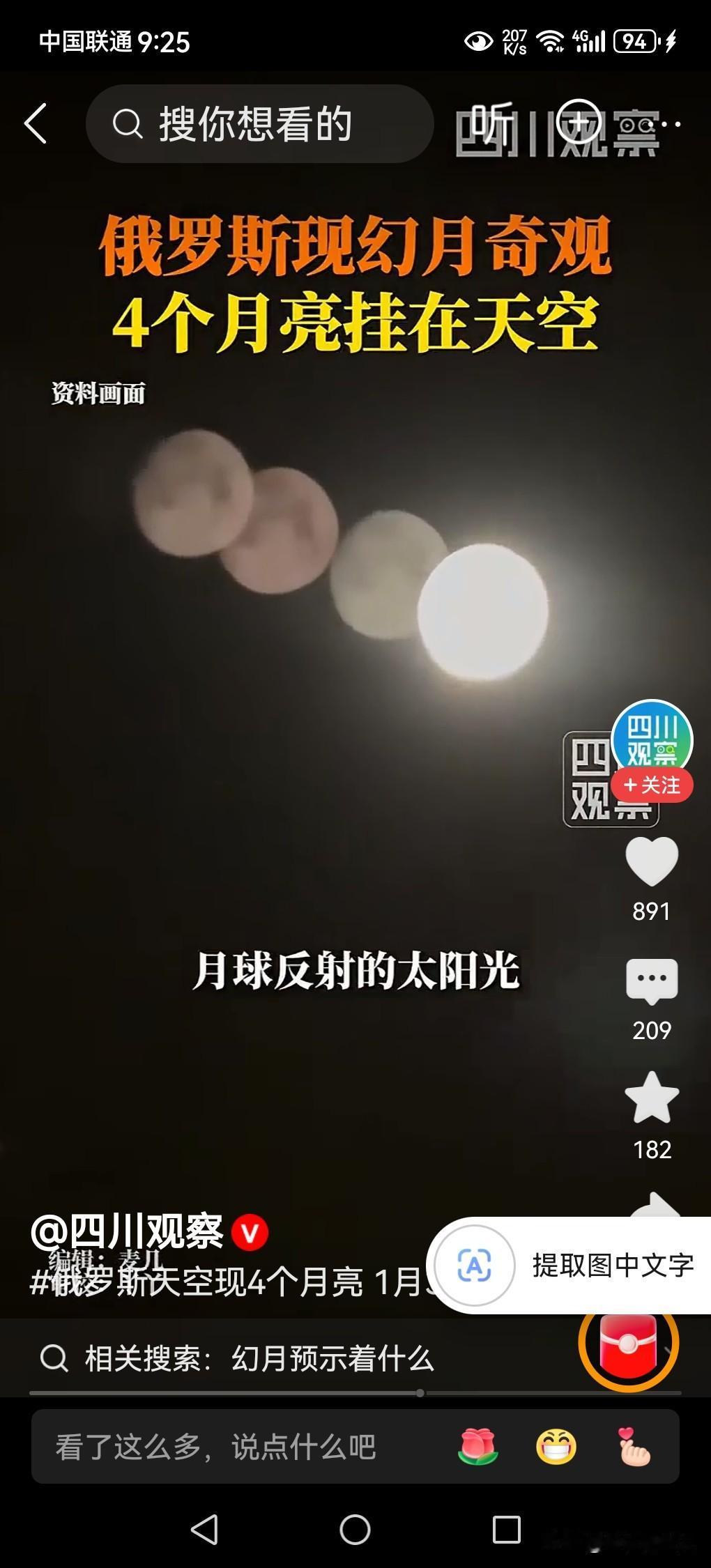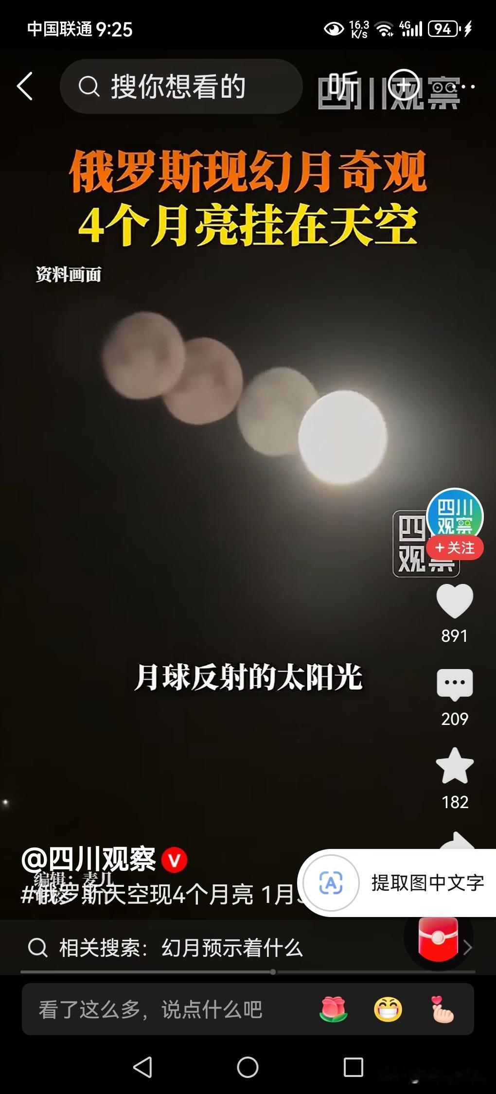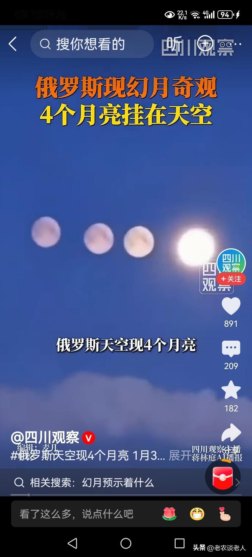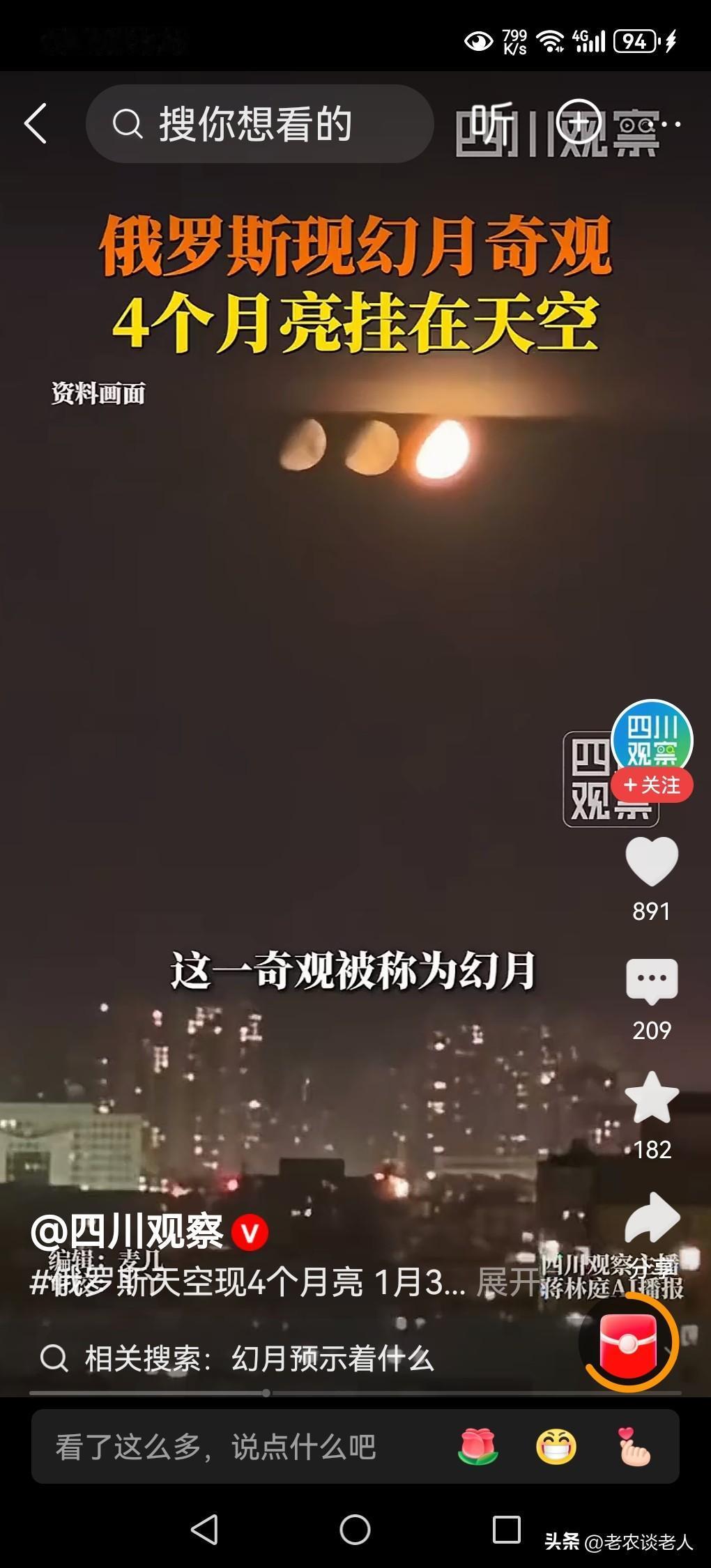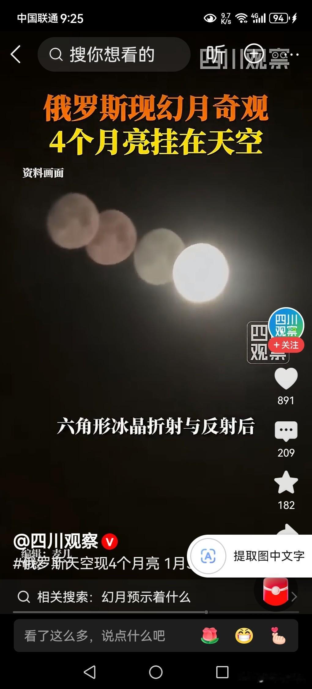 天空出现4个月亮!奇观发生在俄罗斯圣彼得堡! 晚上天空出现一个月亮不是奇怪的事,当天空出现4个月亮的时候,你觉得非常奇怪,这究竟是什么原因造成的?天上真的有4个月亮吗? 据媒体2月2日报道,俄罗斯圣彼得堡市,在1月31日晚上,天空出现了4个月亮,吸引了很多人的关注,引起了网络的热议。这究竟是什么原因造成的? 据天文学家介绍,这种现象叫做“幻月”。何为“幻月”? “幻月”,用通俗的话说,就是“假月亮”,它形成需要的条件,是极为严苛的,没有达到这个条件,是很难形成这样假月亮的。 这种假月亮形成的过程是:每当月亮所反射的太阳光,被穿过地球高空大气层外围的时候,若遇到大气层里面由卷云或者卷云层携带的水蒸气,冷却所形成的大量呈六角形的扁平冰晶,月亮反射的光线就会在冰晶表面发生反射与折射,从而在真月亮周围形成明亮的虚假的月亮光斑。 这些六边形冰晶所形成的过程是,地球大气层高空中的那些扁平六边形的冰晶,通常通过卷云或者卷云层携带的水蒸气,是在零下20℃及以下的环境中所形成的,条件非常苛刻,没有达到这些条件,就不能形成这些扁平的六边形冰晶,就不能产生光线的反射和折射,也就不能形成“幻月”。 地球大气层外围的高空中,这些水蒸气所形成的冰晶,如同天空中的由许许多多的“棱镜”整齐排列,所形成的阵列,并且要与地球上的观测者的角度精准匹配,才能让观察者所看到的月亮虚像,是清晰可见的。 这次俄罗斯圣彼得堡所出现的“四个月亮”,就是地球大气层外围的高空中,由许许多多的六边形冰晶层,所排列分布非常均匀,在真的月亮上下左右即周围,同时形成了三颗清晰可见的虚幻假月。 总而言之,客观事实,天上只有一个太阳,一个月亮,一个地球,天上出现的这些多个月亮,都是一种幻境,都是由空气中的水蒸气所形成的晶体反射和折射,所形成的虚假的图像,并不是真实的,给人造成了一种假象而已。 以上是本人观点,如有不妥,请大家在留言区中留下你宝贵的意见,并积极参与评论。