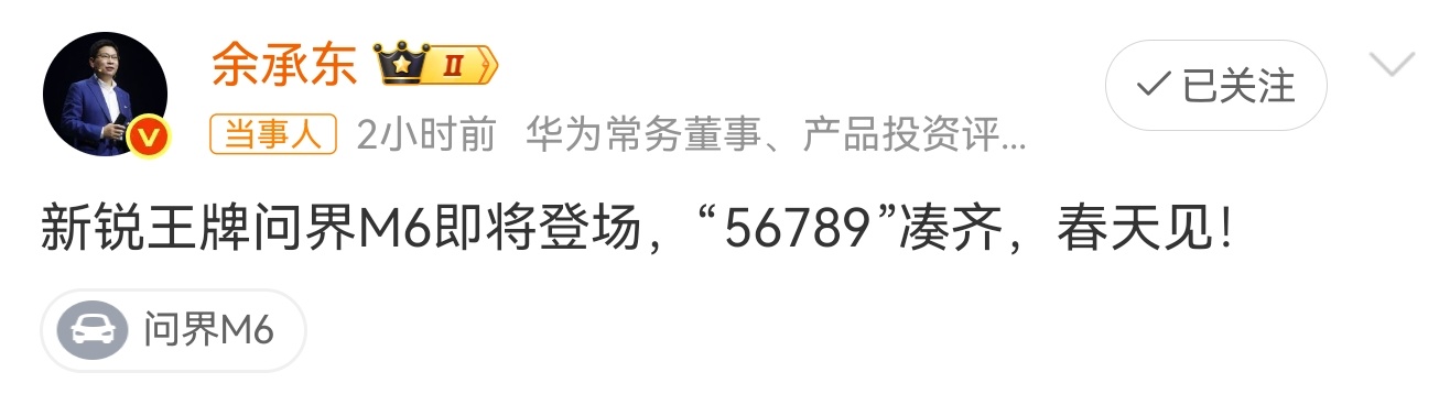 余承东说问界M6春天见新车定位“新锐王牌”,将补齐问界SUV序列“56789”中的关键拼图,主攻年轻市场并填补25-30万元价格带空白。