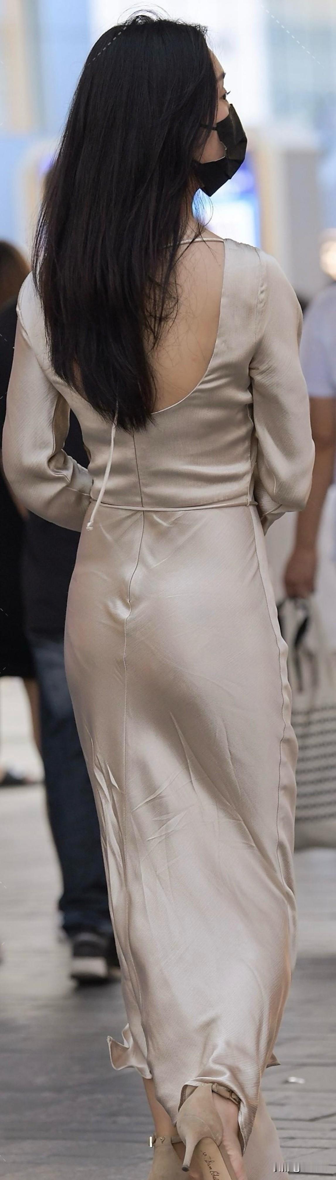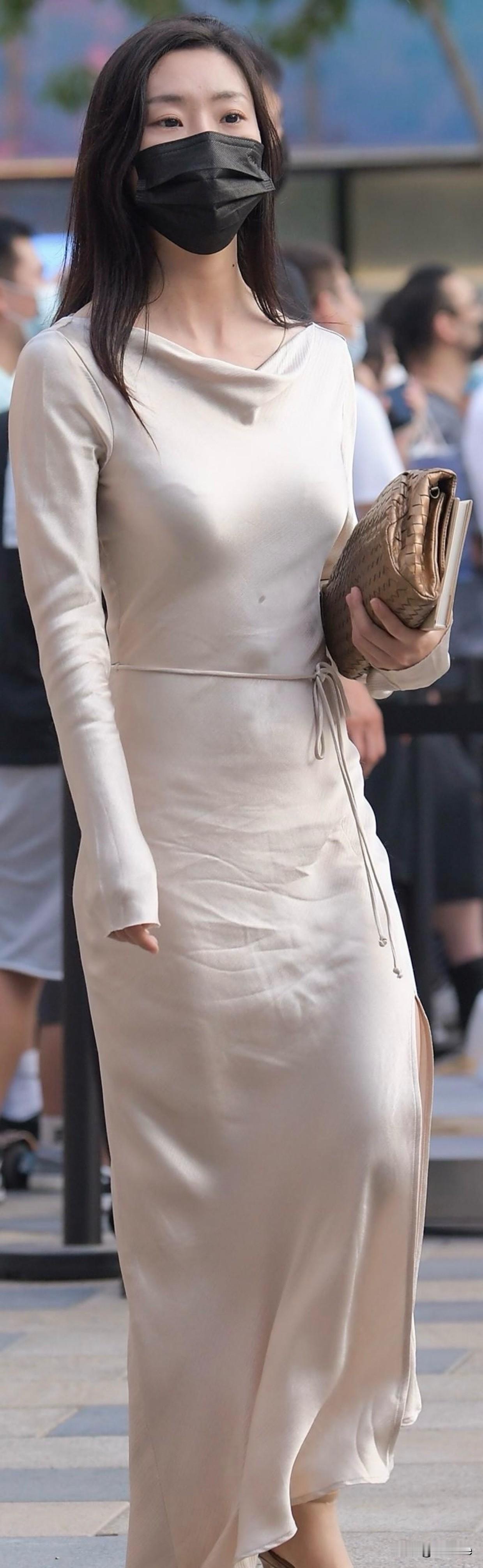 优雅长裙穿搭,简约时尚,搭配黑色口罩,尽显都市风范。