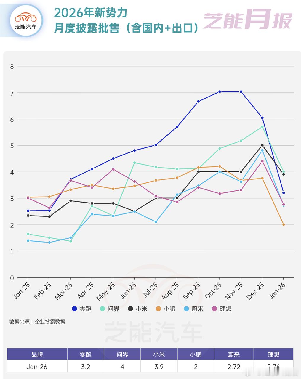 新势力分化明显,华为系、小米交付表现突出,蔚来、理想、零跑保持稳定,小鹏因换代节奏销量波动。合资品牌两极分化,部分品牌增长,也有品牌下滑明显。