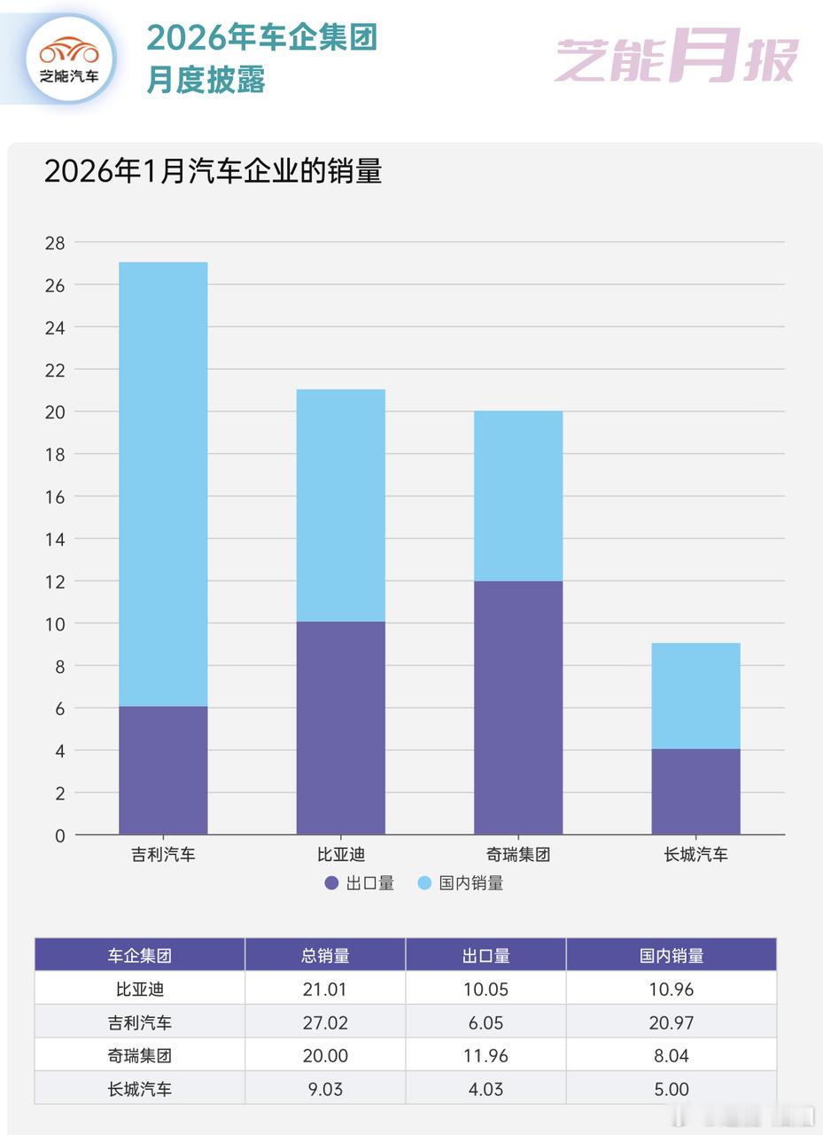 1 月车市批售环比大幅下滑,节前淡季叠加去年年末销量透支,国内销量整体偏弱,出口成不少车企的重要支撑。头部集团中,吉利、比亚迪、奇瑞表现靠前,出口均有亮眼增长。