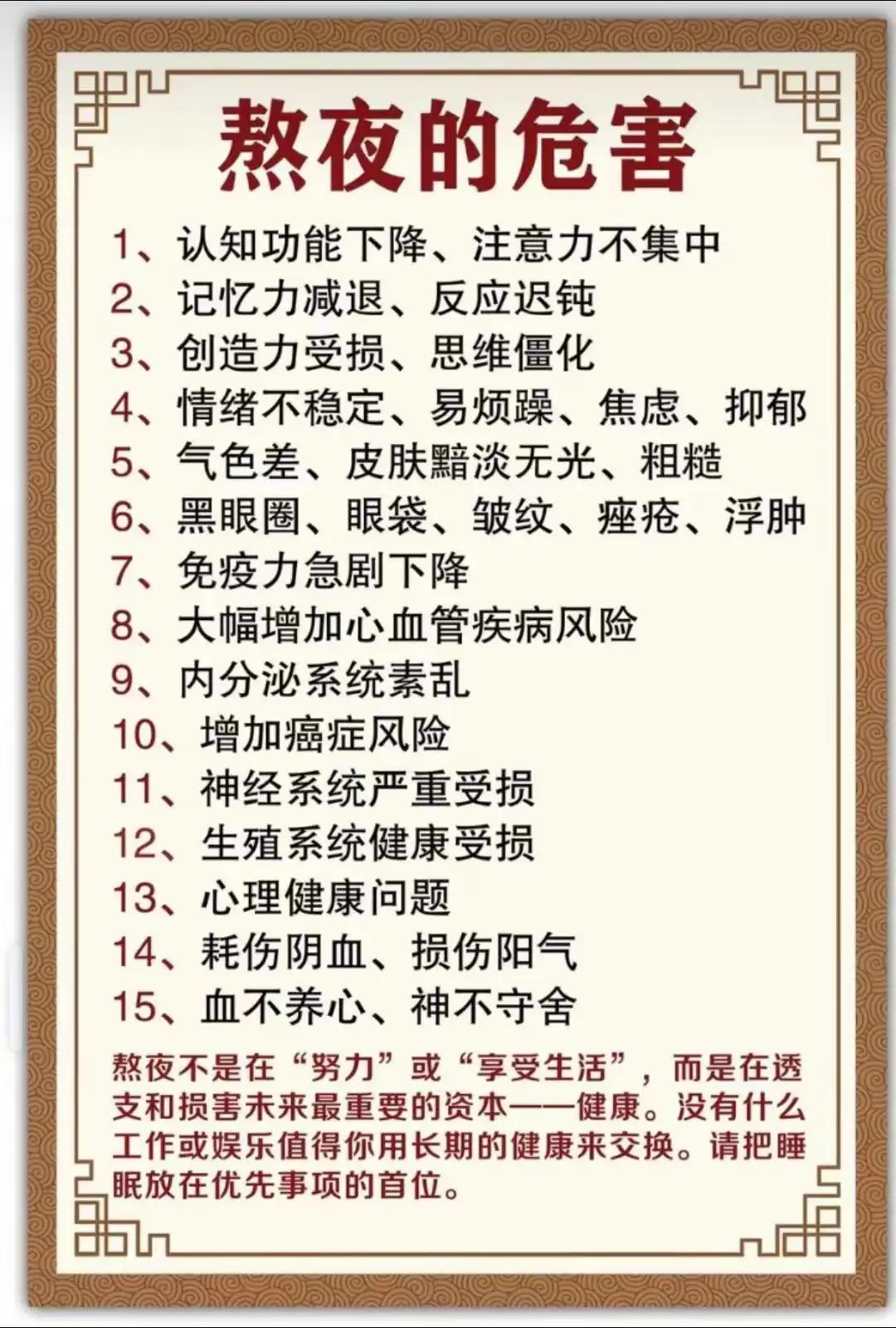 凌晨1-3点肝脏在“滴血”!熬夜熬出脂肪肝和痴呆,这2个时辰是夺命红线 (来源:综合中国睡眠研究会、美国免疫学学会及临床医学数据) 你以为熬夜只是第二天困一点?大错特错。当指针划过深夜23点,你的身体正进入一场生死攸关的修复战,而很多人却亲手关掉了修复开关。这不是危言耸听,这是无数临床数据和血泪教训堆砌出的健康警报。 那两个被无数人忽视的时辰——23点到凌晨3点,正在成为现代人健康的隐形杀手。细分来看,23点到1点是身体修复的基础关,凌晨1点到3点则是脏器修复的核心关。错过这两个黄金时段,补觉只是自欺欺人。 中国睡眠研究会数据显示,近半数人习惯零点后入睡。而美国免疫学学会最新研究发现,仅仅熬这一个晚上,身体炎症反应就会被直接激活,免疫细胞的特征都会发生改变。你的身体在尖叫,而你却戴着耳机。 凌晨1点到3点,这是肝脏细胞修复再生的黄金窗口。此时进入深度睡眠,全身血液会集中供应肝脏,毒素代谢效率达到一天顶峰。身边那位做电商的朋友,常年凌晨两三点才睡,去年体检转氨酶飙升,脂肪肝找上门。医生看着报告单直摇头:“这就是熬夜熬出来的。” 临床数据冰冷而残酷:长期熬夜人群患脂肪肝的概率是规律作息者的2到3倍,转氨酶异常风险增加40%。你的肝脏在深夜默默工作,而你却用短视频和游戏让它超负荷运转。 伤害远不止于此。首都医科大学郭兮恒教授指出,违反生物节律的熬夜会让心血管疾病发病风险暴增5倍以上。血压飙升、心律不齐成为常态,大脑无法有效清除代谢废物,长期积累导致健忘、注意力涣散,阿尔茨海默病风险悄然攀升。 那些熬完夜第二天脸色蜡黄、痘痘疯长、精神萎靡的朋友,别再怪护肤品不够贵。那是你的身体在发出最后通牒,是内脏在求救的信号。这根本不是咖啡和营养品能弥补的损伤。 总有人说工作太忙不得不熬。如果实在逃不过23点后的加班,请至少做到这几件事:拒绝宵夜和浓茶咖啡,多喝温水促进代谢;熬夜后不要疯狂补觉,比平时晚起一小时足矣,中午小憩20分钟;日常饮食多选择西兰花、菠菜等清淡蔬果,给你的肝脏减减负。 身体的生物节律是千万年进化的智慧结晶,23点前入睡不是矫情,而是最划算的自我投资。别等到体检报告上出现异常箭头才追悔莫及,别等到记忆力严重衰退才想起早睡的好。 今晚就放下手机吧。关掉那盏陪你到凌晨的灯,给你的身体一个修复的机会。毕竟这台精密机器只有一次保修机会,坏了,真的很难修好。如果你也曾在深夜挣扎,如果你也见过熬夜带来的伤害,请把这份提醒传递给还在熬夜的人。 熬夜真相 健康警报