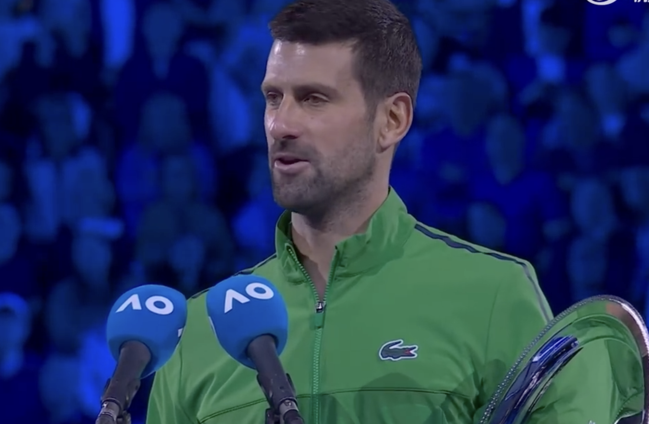 虎扑02月02日讯澳网男单决赛,德约科维奇6-2/2-6/3-6/5-7不敌阿尔卡拉斯,获得亚军。赛后现场感言,德约首先恭喜阿卡夺冠,并感谢团队的支持、纳达尔的观赛以及观众的陪伴。