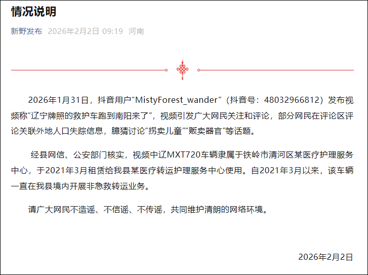 2026年1月31日,抖音用户“MistyForest_wander”(抖音号:48032966812)发布视频称“辽宁牌照的救护车跑到南阳来了”,视频引发广大网民关注和评论,部分网民在评论区评论关联外地人口失踪信息,臆猜讨论“拐卖儿童”“贩卖器官”等话题。