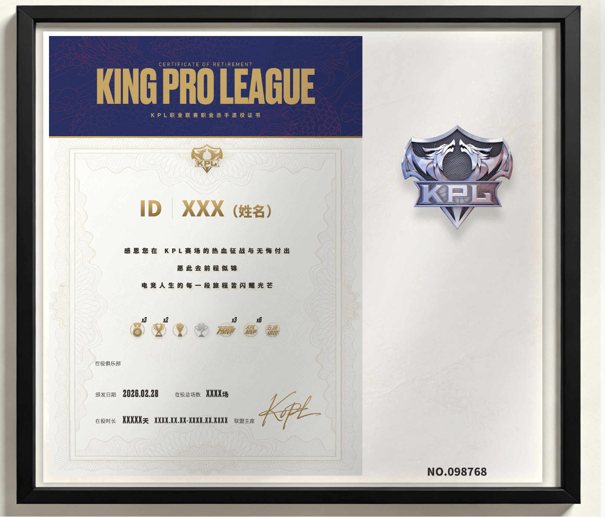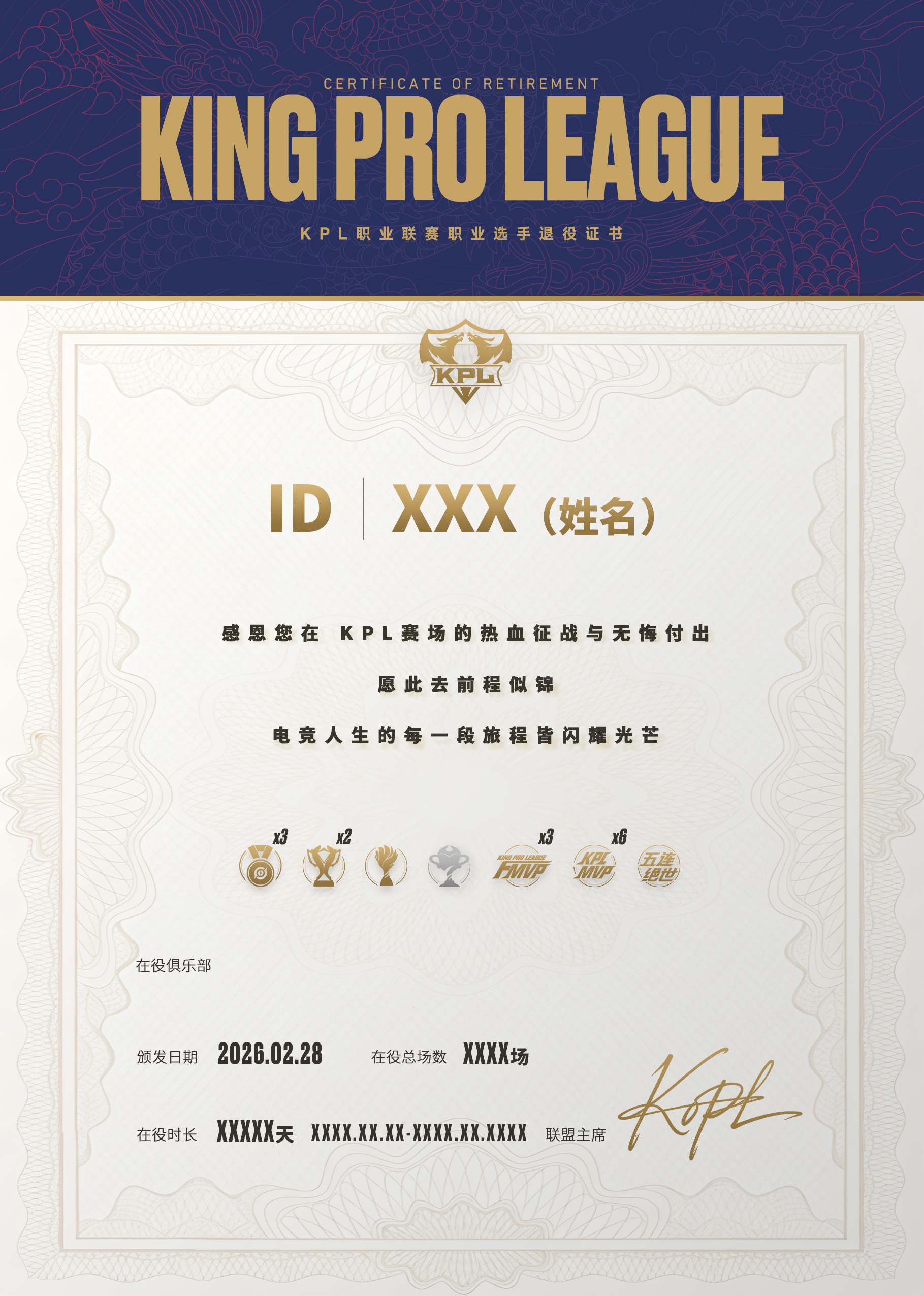在KPL十周年到来之际,为表达对选手多年付出的感谢,KPL官方将推出十周年选手致敬典礼;同时,为所有正式提交退役申请的KPL职业选手颁发退役证书(包括已提交申请者和未来提交申请者)。