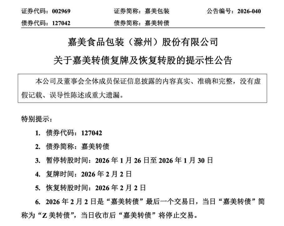 2月2日,停牌一周的嘉美包装复牌。嘉美转债复牌并恢复转股,与此同时,“嘉美转债”迎来最后一个交易日,复牌日即最后交易日。