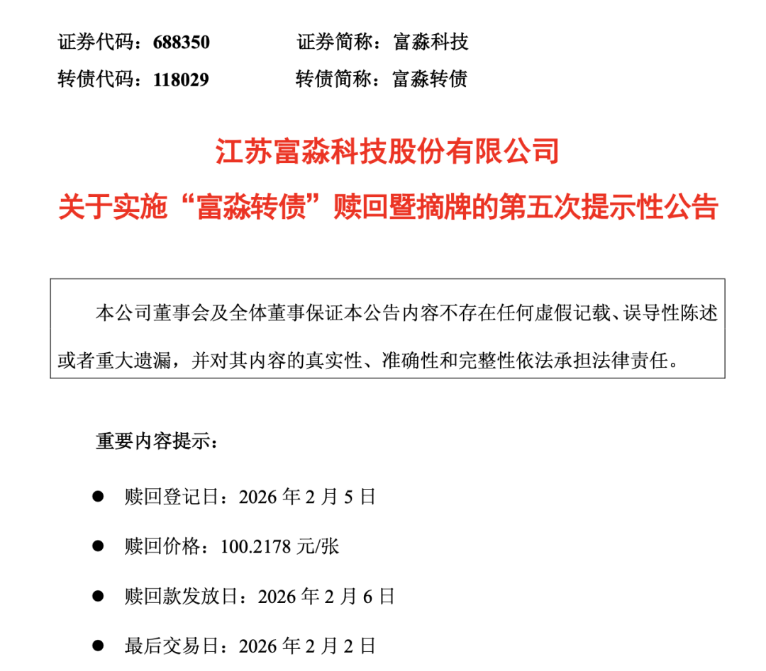 2月2日为“富淼转债”最后一个交易日,2月5日为“富淼转债”最后一个转股日。投资者所持可转债除在规定时限内通过二级市场继续交易或按照18.60元/股的转股价格进行转股外,仅能选择以100元/张的票面价值加当期应计利息(即100.2178元/张)被强制赎回。