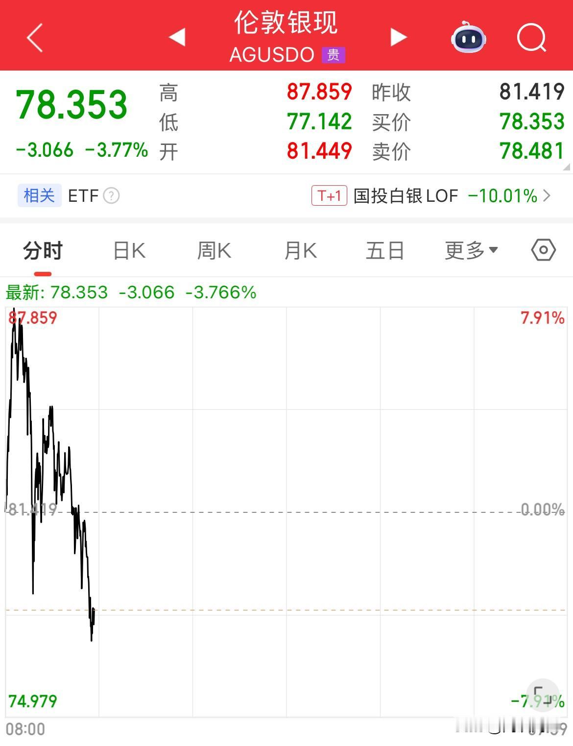 现货黄金大跌200美元/盎司,跌破4700美元/盎司,高位下来跌了900美元了,现货白银开盘一度冲到87美元/盎司,冲高回落后直接抹去涨幅,下挫至78美元/盎司,盘中振幅10美元/盎司,高点下来已经跌幅44美元了,涨一个月,跌只需要两三天,顶部追进去的,肯定是高位站岗了。