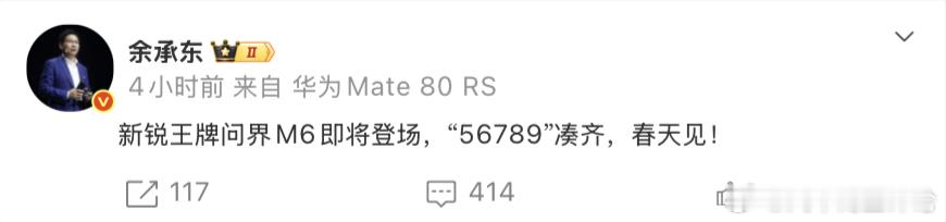 问界M62月2日,华为常务董事、产品投资委员会主任、终端BG董事长余承东表示,新锐王牌问界M6即将登场,“56789”凑齐,春天见!