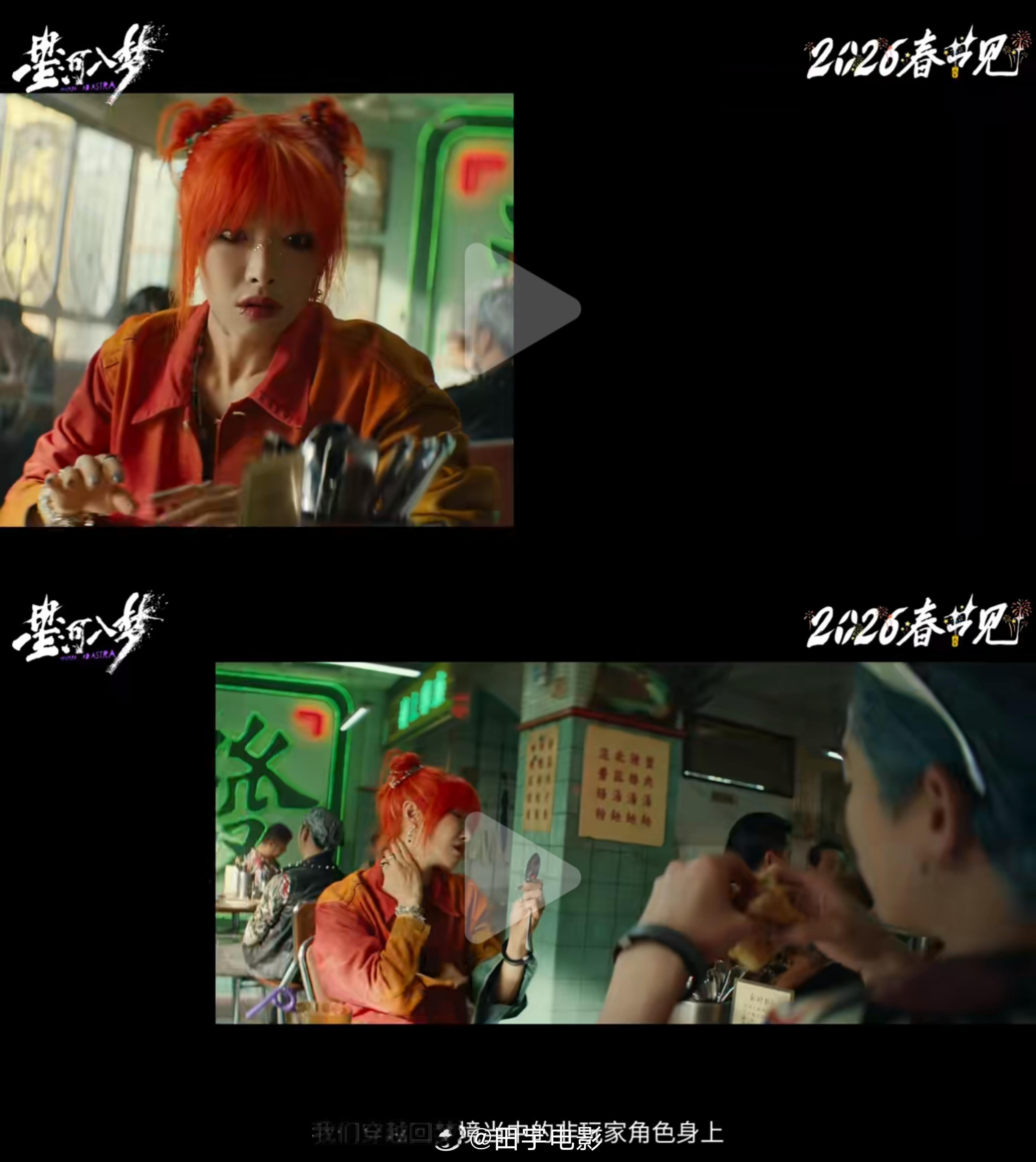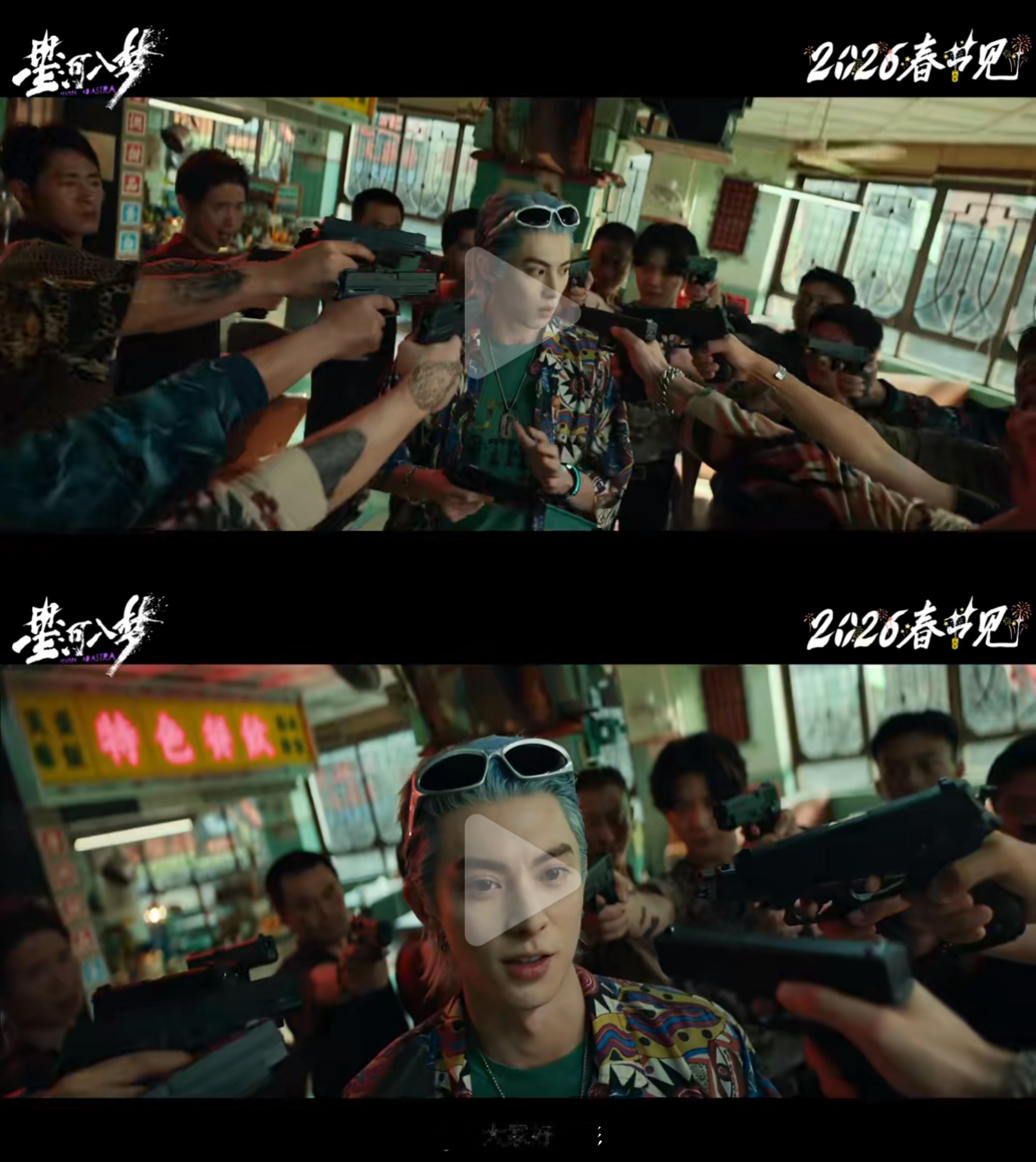 王鹤棣徐天彪、宋茜李思蒙通过梦境穿梭到了香港,港风拉满。他俩的妆造超级时髦,李思蒙被NPC的开枪射中,脑门流血,宋茜在港风梦境的场景中,穿的衣服是cosplay风格的,王鹤棣穿花衬衫,蓝色头发,讲粤语。说进入到这个梦境里就会附带非NPC人物的属性,你中有我,我中有你。面对黑帮的追杀,王鹤棣开枪了,结果呢?枪里没子弹,从枪口弹出了个小条幅旗开得胜。王鹤棣无奈的神情,说了句大家好。