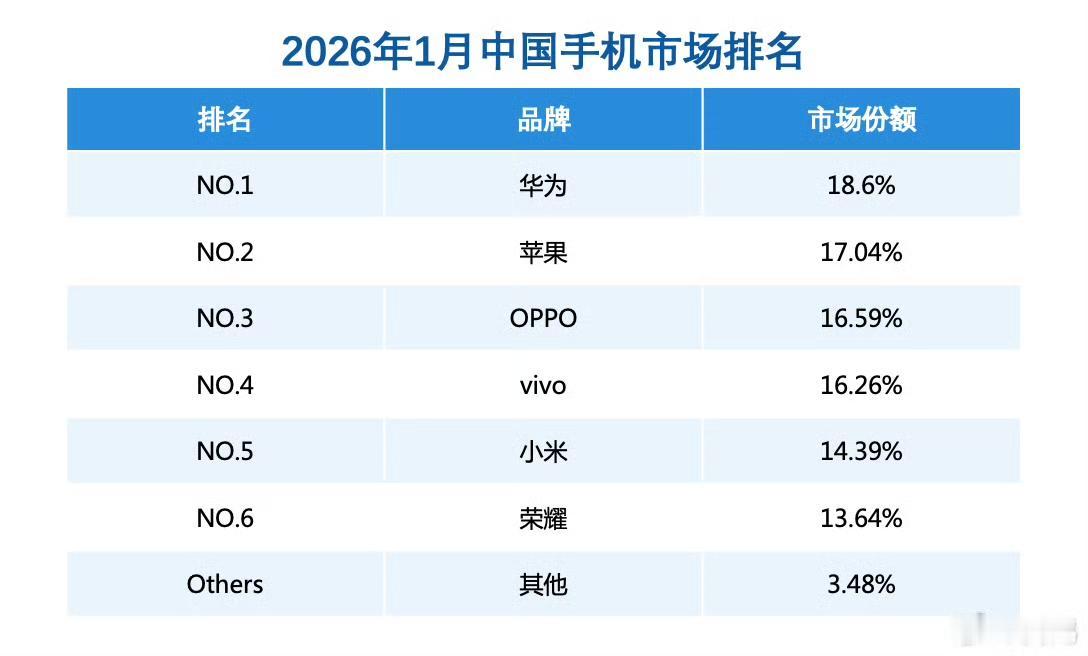 Sell out公布2026年1月中国手机市场份额 1、华为 18.6% 2、苹果 17.04% 3、OPPO 16.59% 4、vivo 16.26% 5、小米 14.39% 6、荣耀 13.64% 华为领跑新年手机市场,大家都准备换哪款新手机啊?