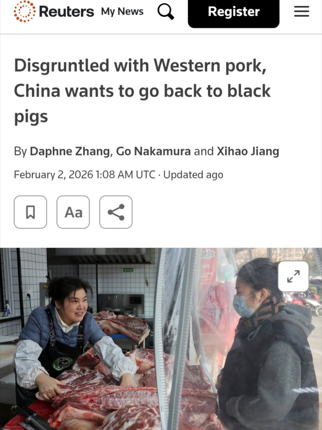 连路透社也知道中国人有钱了,越来越爱吃本土黑猪肉,不爱吃西方引进的白猪肉。图1。划重点:很多黑毛猪仍然是杜洛克白猪的杂交后代,只是毛是黑的。